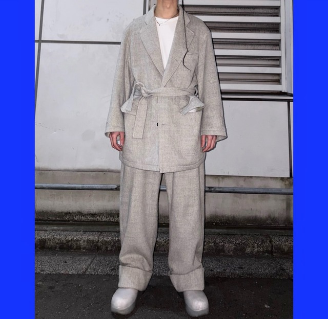 call fathers jacket & pants 球数自体少ないこちら、セットアップだと更に見つけにくいかと思います パジャマの様にリラックスして着られます シャギーニットの様な毛足の長い柔らかいウール ガウン、チェスターコートとテーラードジャケットの間の様な作り 肩幅、身幅を大きく取り全体的な落ち感を楽しめます 身体に馴染むように硬い芯地や肩パッドは排除しています ベルトを絞ることでシルエットを変えられます ポケットはスルーポケット+通常ポケットでジャケットやパンツポケットに直接アクセスできる作りです 襟を立てて、コートのように着用しても良し とっても柔らかくてきれいな糸面の梳毛糸を使った毛足のあるビーバー仕上げ 裾はたっぷり幅の取ったダブル仕上げ size : (実寸l~xl程度) 着丈87身幅69肩幅55袖丈60 size : ウエスト通常時77〜78股上38(ウエスト最上部から)股下73わたり36裾幅32.5サイドの全長104〜104.5 裾に黒ずみと少し折り目にダメージがあります