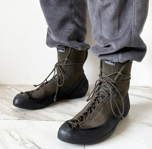 2005s/s stone island la sportiva oliue green boots イタリア発祥のアウトドアブランド、スポルティーバとのコラボ ソールやサイドがグリップ力のあるゴムとなっていて、岩場など様々な角度から影響を受ける場所でも滑りません レスリングシューズやドライビングシューズの様なフラットなソール つま先まで紐が来る感じがとても良い 太めのパンツの裾から紐がちらりと 尖ったトゥも珍しい作りですね ミリタリーライクな深いオリーブグリーン 切れた紐の中からネオングリーンとグレーの糸が、、切れる前提作り?? コレクターアイテム size 44? 27.5cm〜28.0cmの靴を履く自分でちょうど良いか、少しだけですがゆとりがあります およそ28.0cm〜28.5cmでしょうか 少し大きい分にはギュッとくるぶしも紐で固定できるので問題ないかと 全く問題ないですが、右側の紐が切れて多少短いです ソールなどに擦れ、小汚れはありますが、この年代の靴にしてはかなり状態が良いです