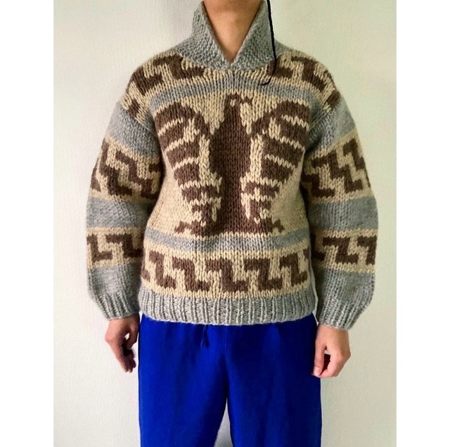 unisex 90s 〜 North British loofa shawl collar design new wool sweater 韓国製 ノースブリティッシュ ヴィンテージライクなザックリ編み この手の柄のヴィンテージオリジナルニットは縮んでしまっていたり、ほつれがあったりするのでこのくらいの年代で作ってくれたのはとても嬉しいですね ヘチマショールカラー 立てても折っても良し 超肉厚ニューウール100% もはやアウターです アイスグレー×ベージュ×ブラウン ベージュ部分は微ミックスニッティングに 両面アステカバード size : 表記l(実寸l程度)着丈64身幅61肩幅54.5袖丈60(伸縮性があるので若干実寸に差が出ることがあります) モデル178cm/70kg ウール特有の多少の摩耗感はありますが、嫌な感じの摩耗感ではないかと ネック裏にとても小さな小汚れ