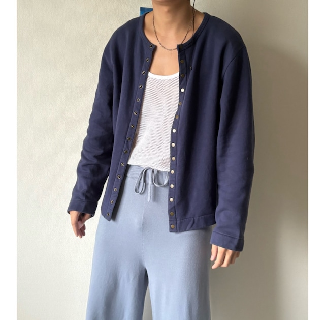 00s agnès b. black cotton snap short cardigan 14連スナップボタン ブラックではなく珍しいネイビー 開けても閉めても、掛け間違えても良し 肉厚スウェット生地 メンズでも緩く着れるサイズ感 この条件を満たす個体は中々ありません 裾アジャスター付き ノーカラー 着丈60×身幅60の極端なショート丈 ヤンキー漫画の短ランの様なシルエット またこちらのモデルはメンズとしては袖丈が足りない個体が多い印象がありますが、この個体は178/70kgの自分でもちょうど良く着られます size : 表記 t3(実寸m〜l程度) 着丈60身幅60肩幅51袖丈63 model 178/70kg