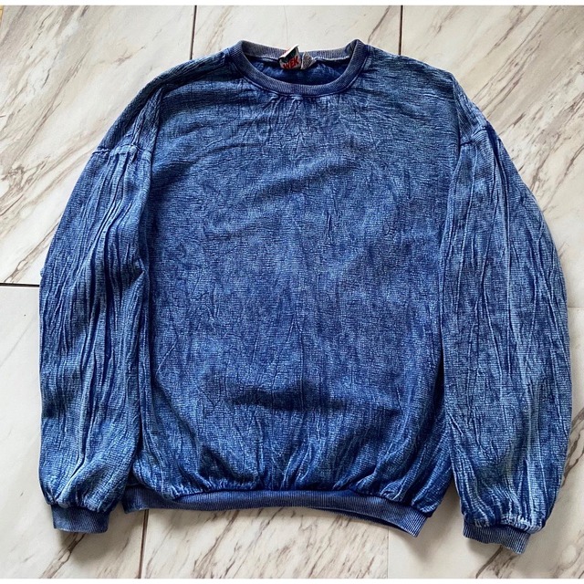 unisex 90s made in usa indigo dye cut-and-sewn インディゴ染め 古着だとニットで多くみられるインディゴ染め トレーナー型のカットソーに施されたパターンは初見 染める時のシワによってできた濃淡ムラのある染まり具合 ランダムが感じが物凄く良い 着丈65cm×身幅65cmのぽってりとしたAラインが可愛らしい 裾リブ付きなので溜めてどうぞ size : 表記s/m(実寸l程度)着丈65身幅65肩幅64袖丈54 モデル178/70kg 本当に若干ですが首リブ内側に黄ばみ 左袖先薄らシミ 袖口にとても小さなダメージ