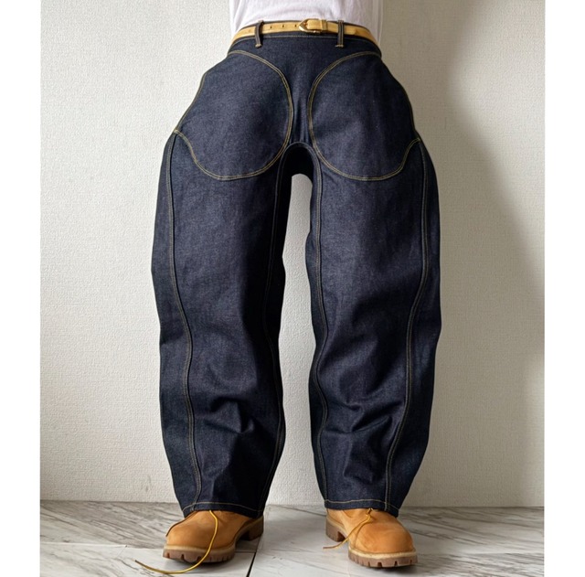 deformed wide leg denim pants "前回より少しだけ裾幅が少し細く、裾で溜まり、引きずりません。また股上を極端に浅くしたローライズとなっています。"腰パンで履き、ベルトは見えて、股上は浅いのでダボっとなりすぎないシルエットが特徴です" 両面に巨大楕円ポケットの付いた面白いデザイン 股ジップ簡略の分、ポケットが強調されます 極太のワイドシルエット 股部分とサイドにマチが付いているので横から見ても立体的なシルエットとなります 濃紺リジッドデニム これからのエイジングも楽しみですね 裾まで極太です size : 表記l(実寸l程度)ウエスト88股上34(ウエスト最頂部から)股下74.5〜75程度わたり31程度(股部分の頂上からサイドまでの計測です)ガゼットクロッチ付け根からサイドまで35裾幅26〜26.5サイドの全長100.5 股上股下腿幅はガゼットクロッチ真ん中まで(から)で測っています