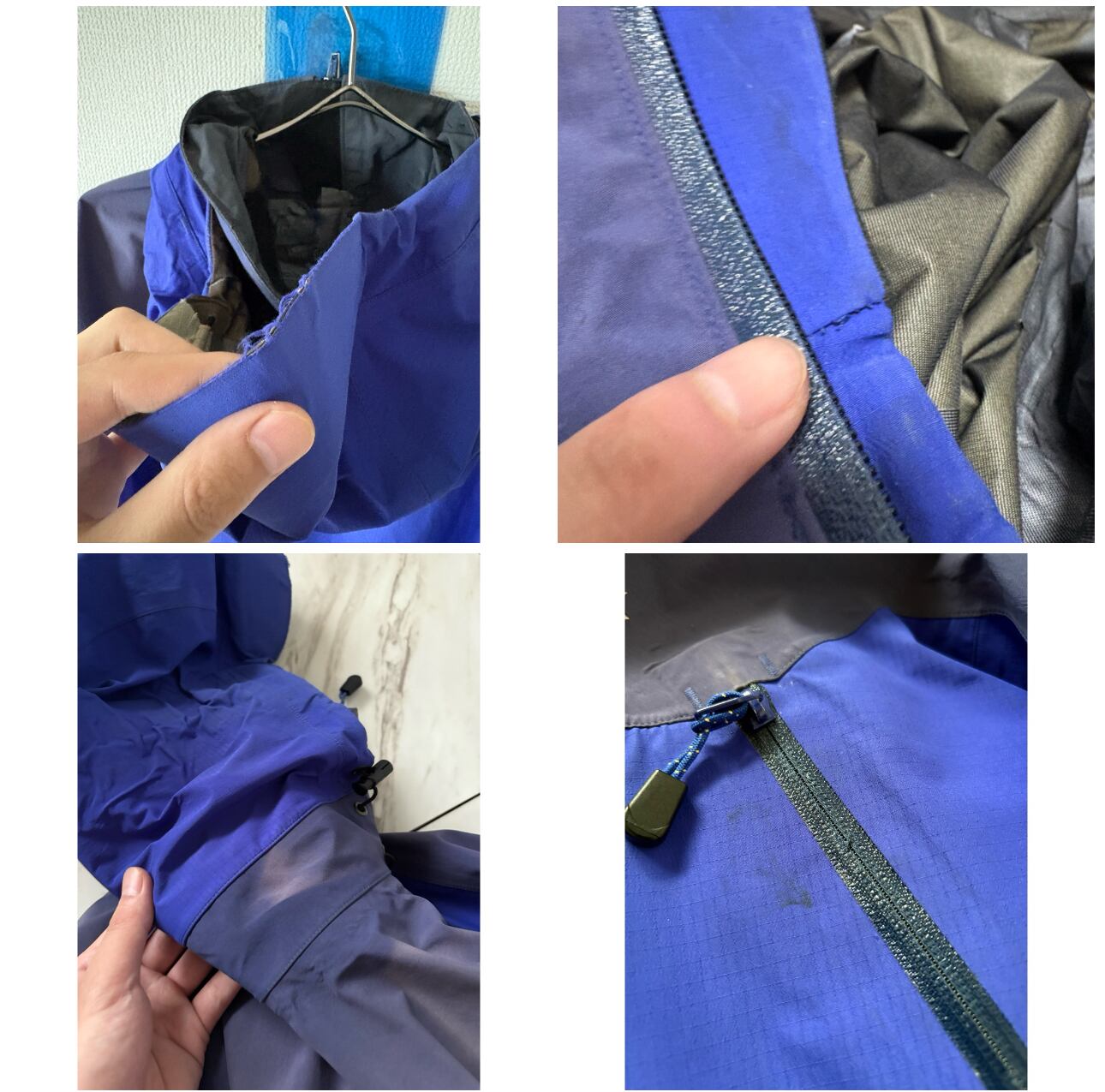 ネイビー部分日焼けや小汚れがあります 右肩に日焼け その他黒ずみ等 フード先に少しダメージ 左ポケット付近にアタリと白い薄いシミ 少し元々のシームテープが剥がれかけていたので新しくシームテープで補強しました 両脇ベンチレーションに止水ジップ縁に浮きあり 素人での補強なので、ペト付き感、(ウエストドローコード部分など)若干の剥がれなどはございますが、自分はなんの問題もなく着ていました