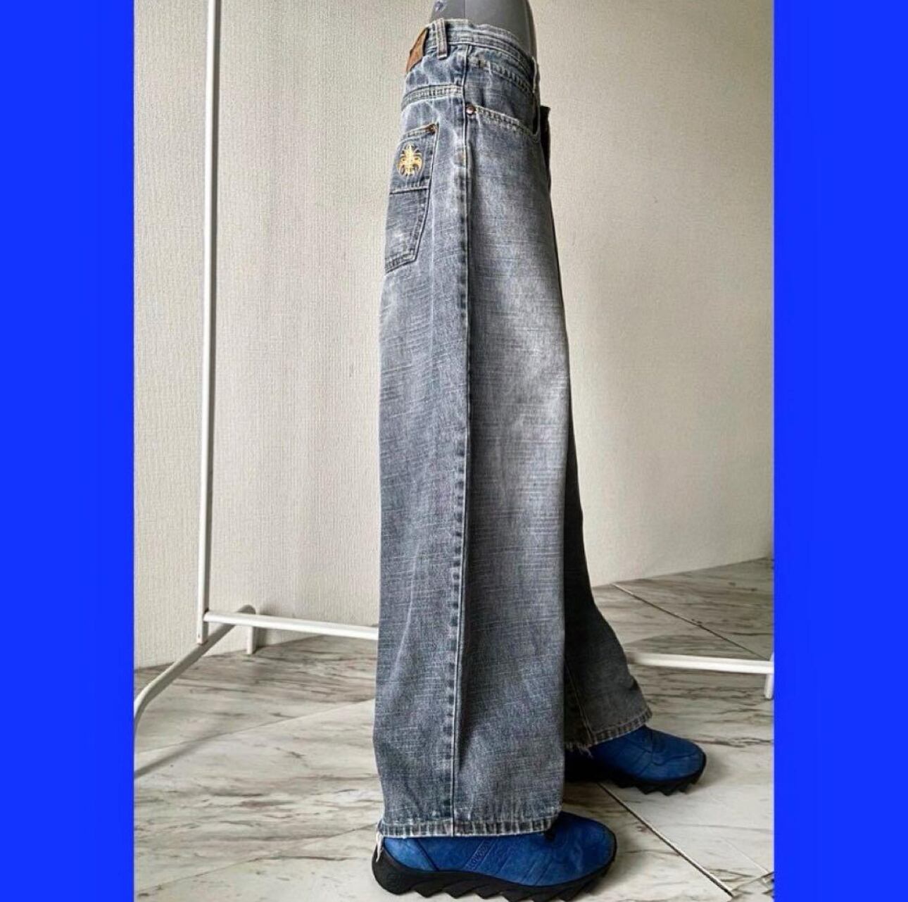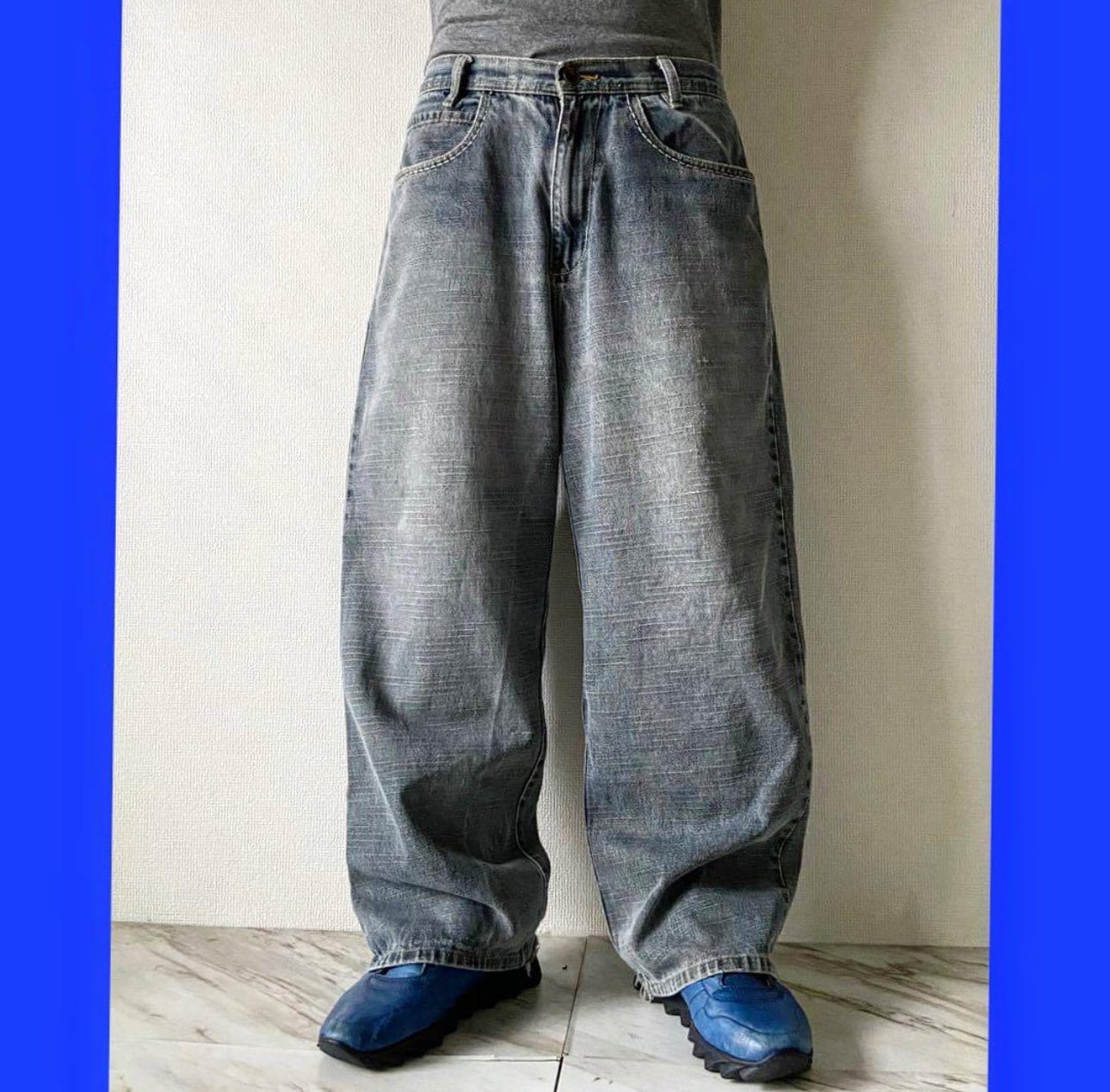 上から下までズドンと太いバギーシルエット 気の利いた 総柄デニムパンツ 総柄パンツ