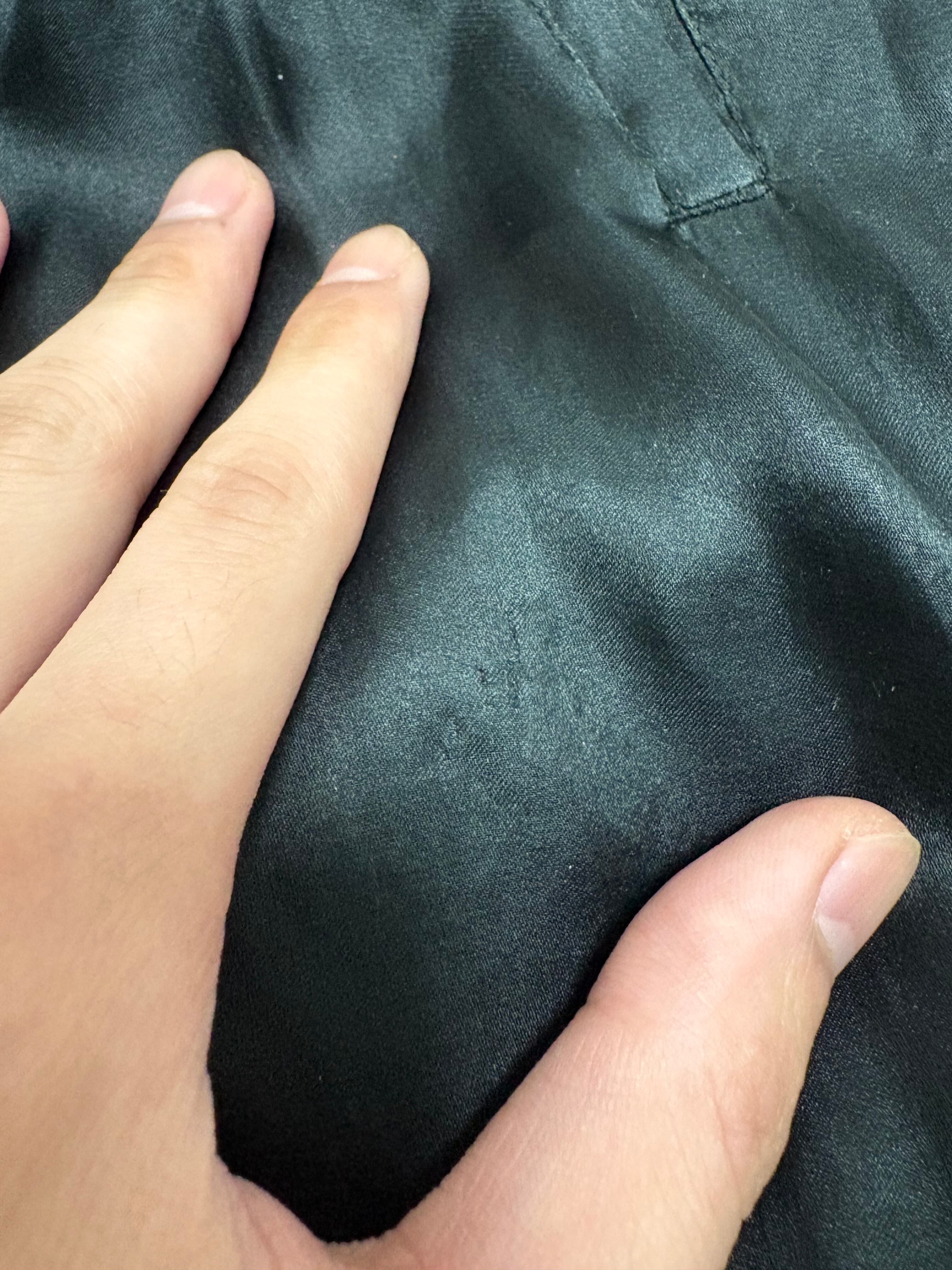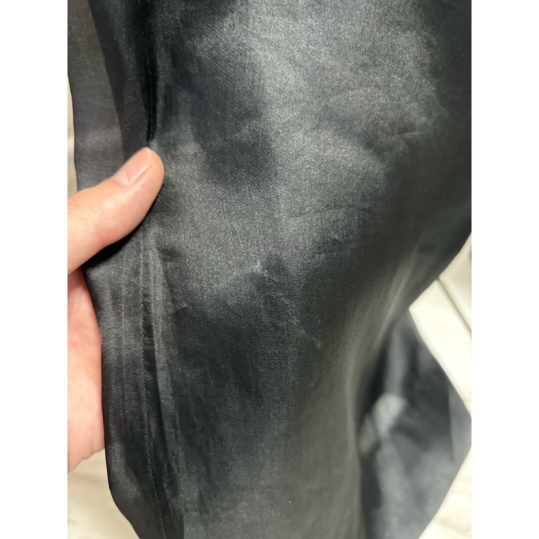 股部分横と左裾後ろあたりに擦れ?の様なもの その他全く気にならない程度の擦れの様なもの 光の入る角度によってはといった感じですが、ウエストラインがシルク特有のブラック→限りなくブラックに近いグリーンに少し見えます
