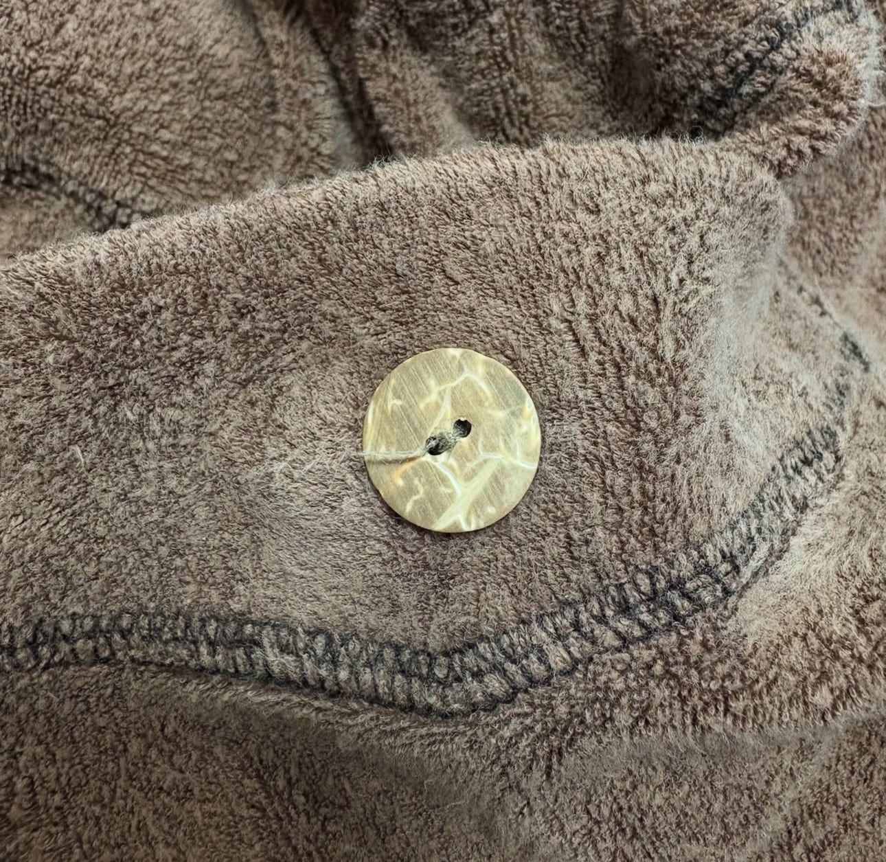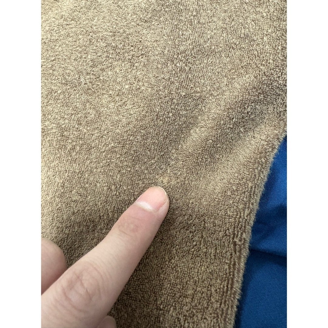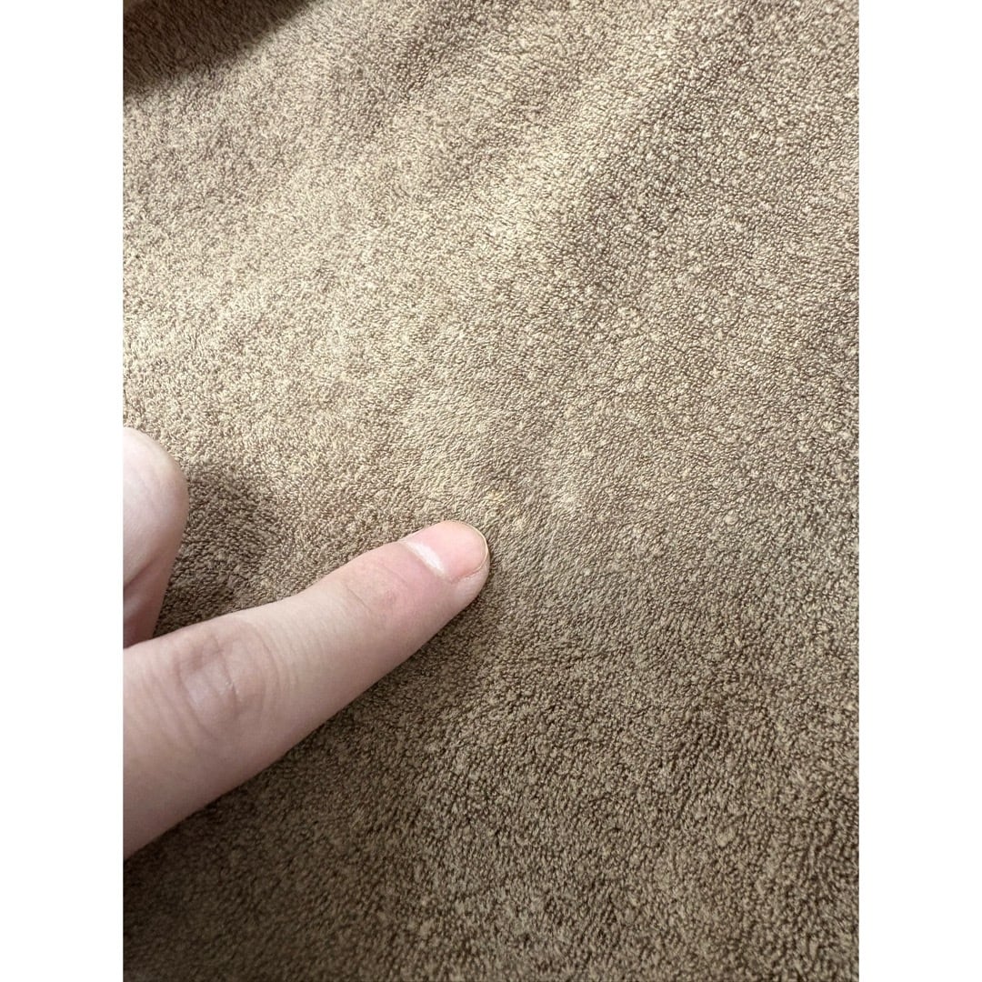 ライトブラウンの熊の様な毛足長めのパイル地 巨大バックポケット フェイクウッドボタンも効いています
