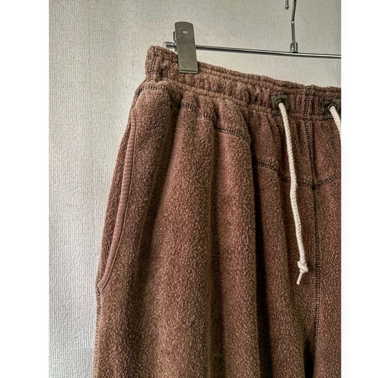 ウエストはドローコード+ゴムのイージー仕様 パジャマパンツの様にラフに履けます この手の股上が深いジョガーパンツは股下が短い物が多いですが、こちらはきっちりと長めなので、だぼっと履けます