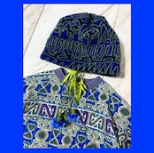 ブルー、グリーン、ブラックのアフリカンバティックの様な総柄 主張弱めの同系色のロゴも効いています