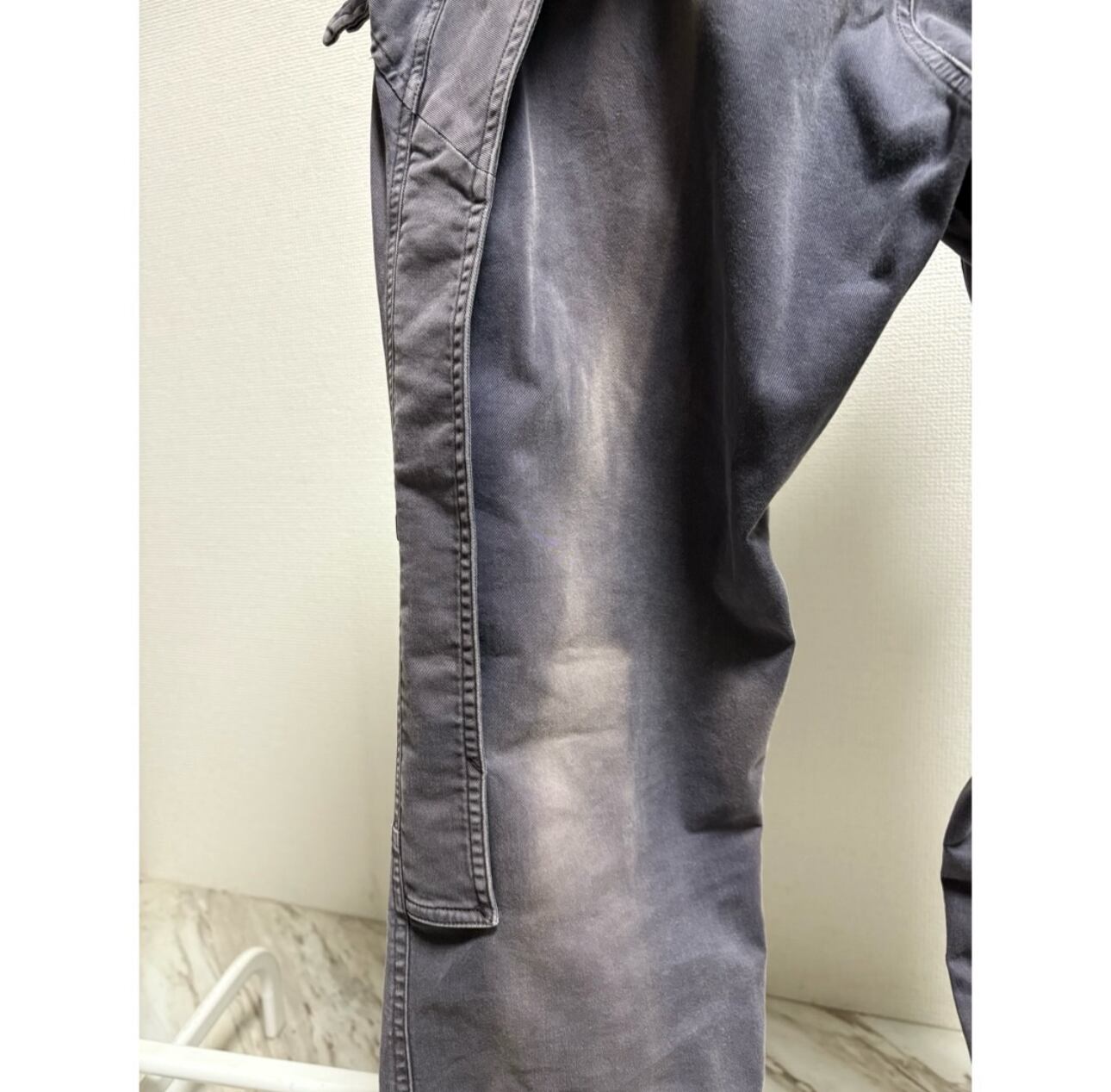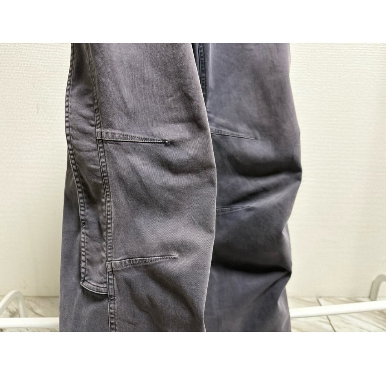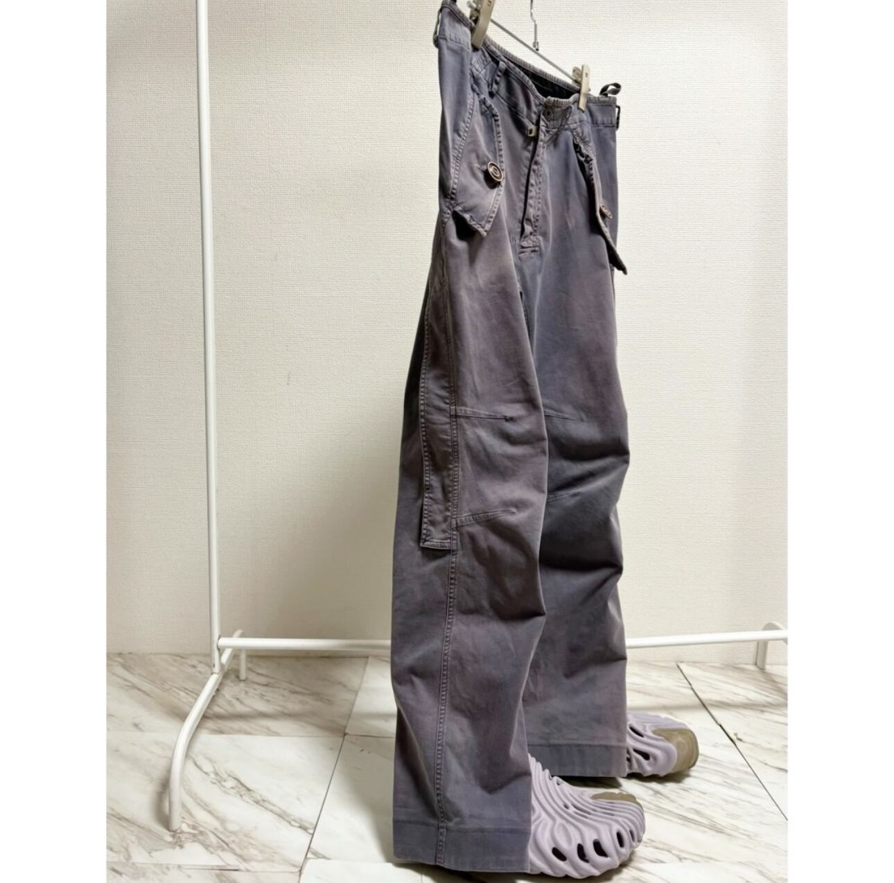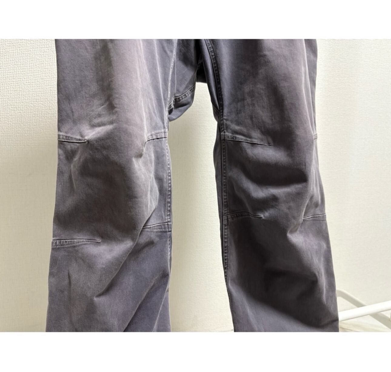 製品染め特有の燻んだ色味のナス紺 10年以上の日焼けによるサンフェード 膝部分にダーツが入っていて横から見た時に立体的なシルエットに