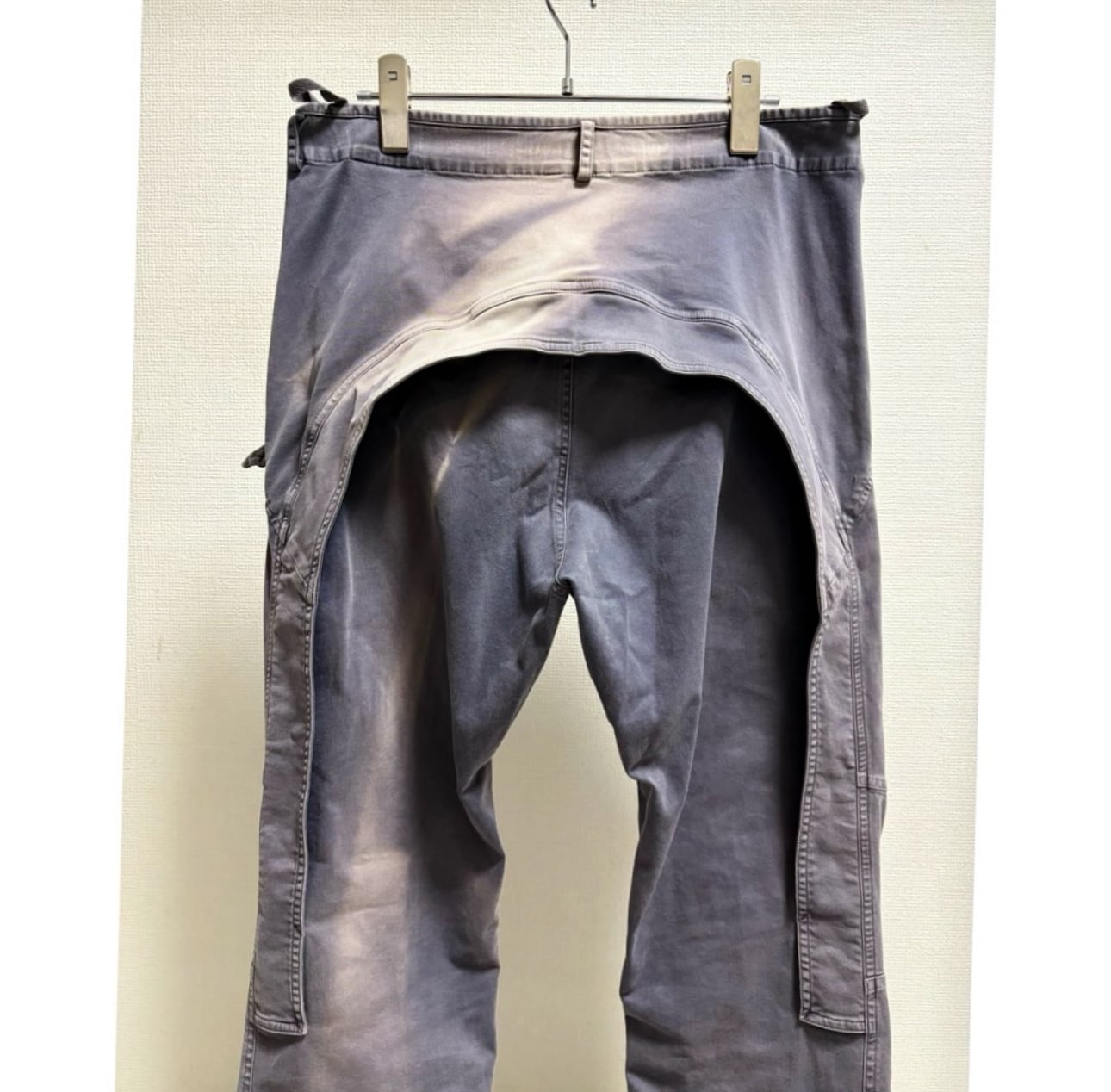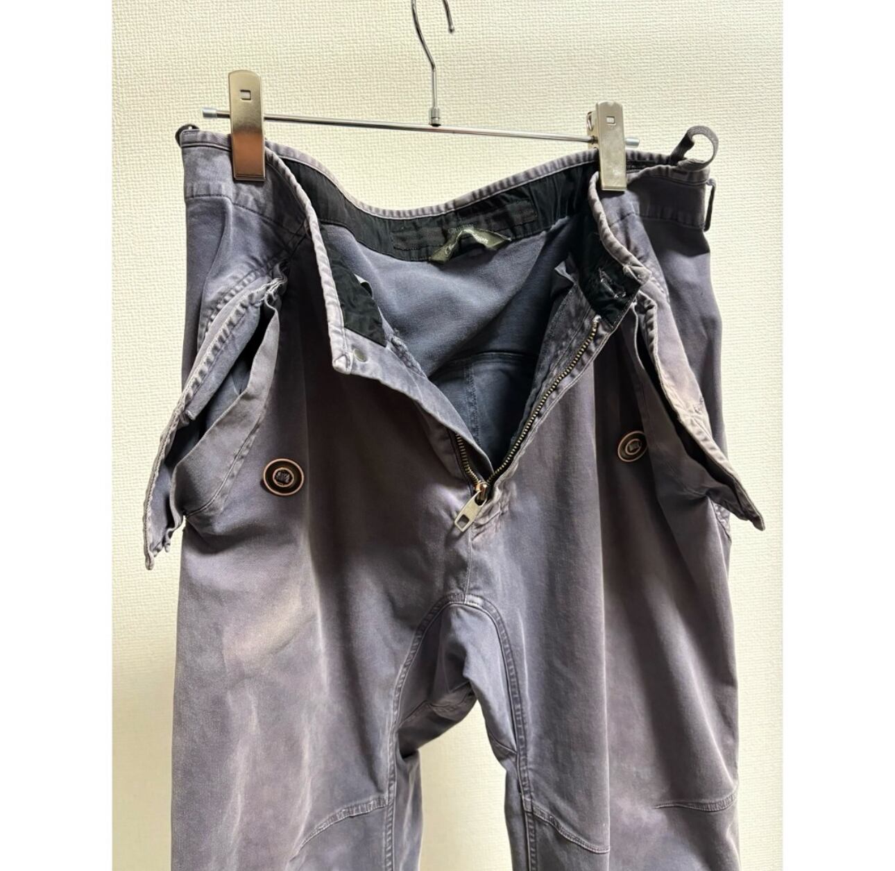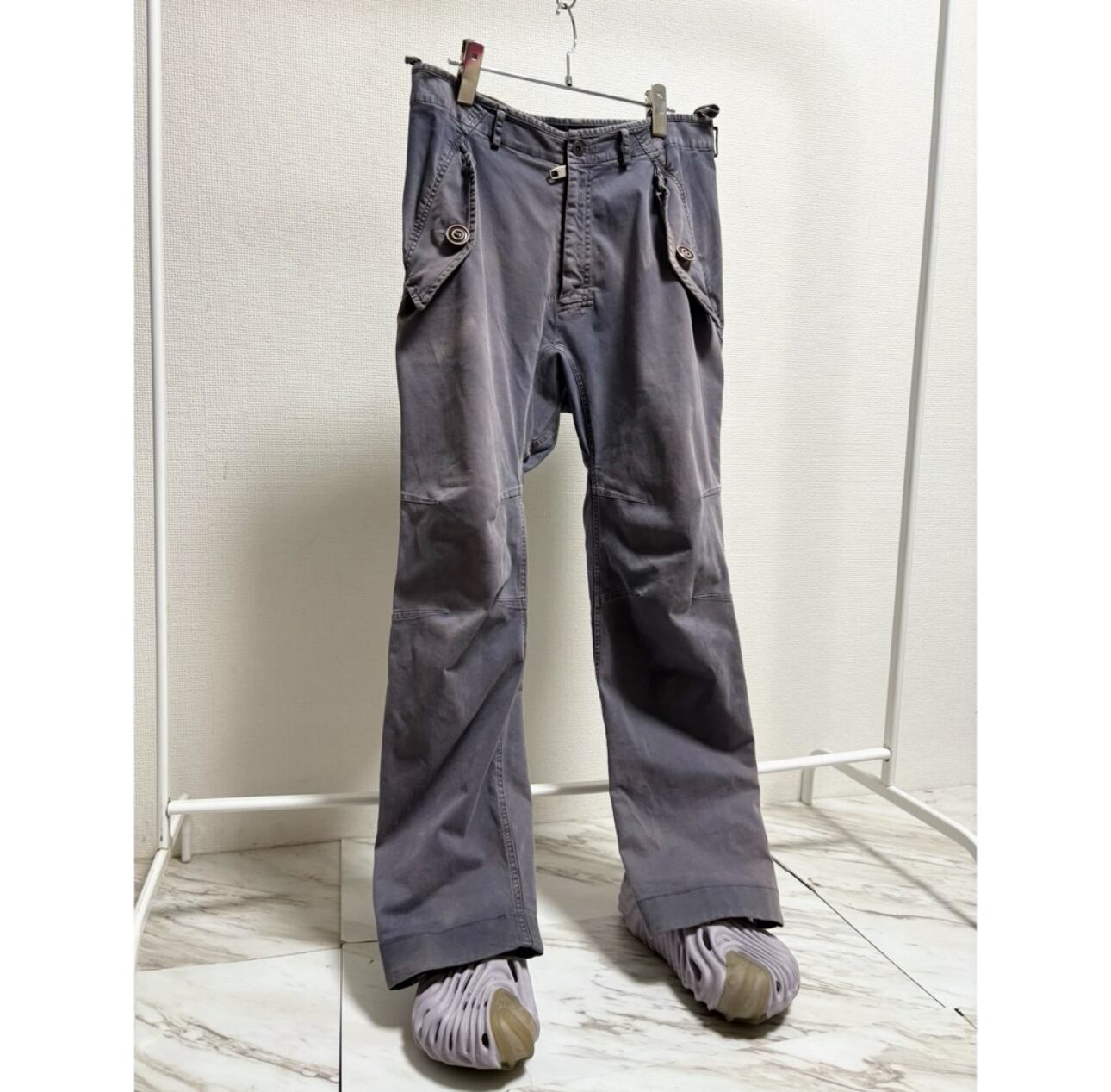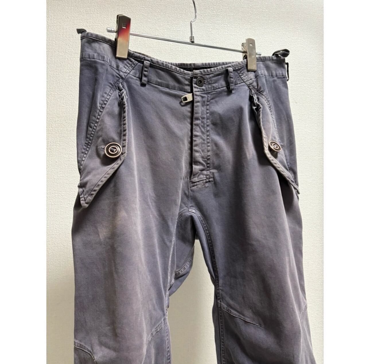 製品染め特有の燻んだ色味のナス紺 10年以上の日焼けによるサンフェード 膝部分にダーツが入っていて横から見た時に立体的なシルエットに