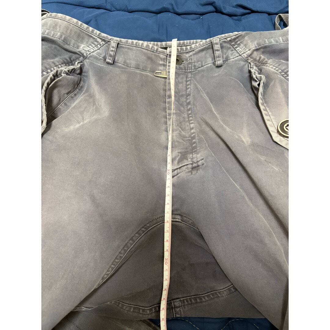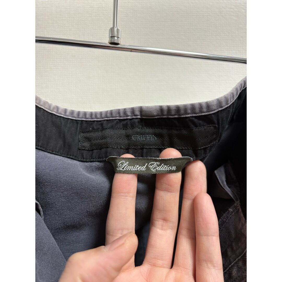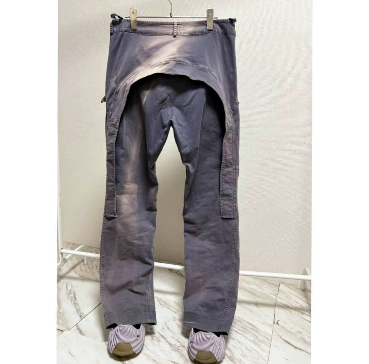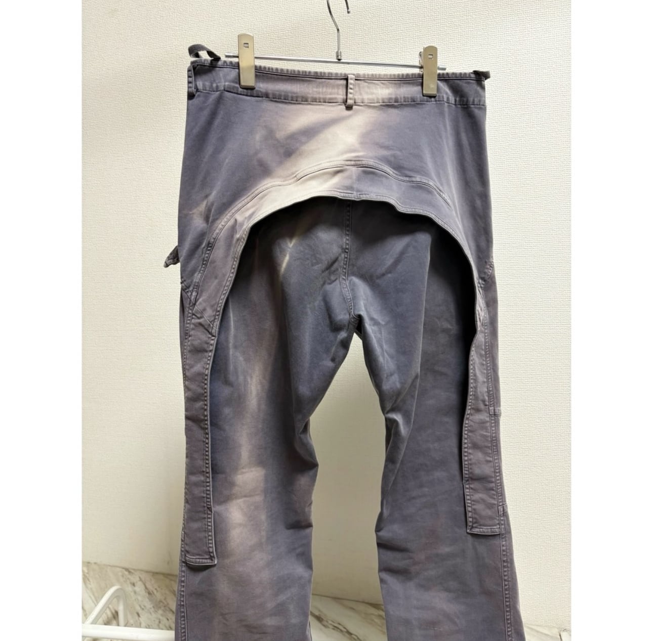 製品染め特有の燻んだ色味のナス紺 10年以上の日焼けによるサンフェード 膝部分にダーツが入っていて横から見た時に立体的なシルエットに