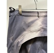 左膝上に極小の白シミ 膝下に薄いシミ 左お尻上にシミ ガゼットクロッチ部分に薄くシミ 裾に少しだけ擦れ
