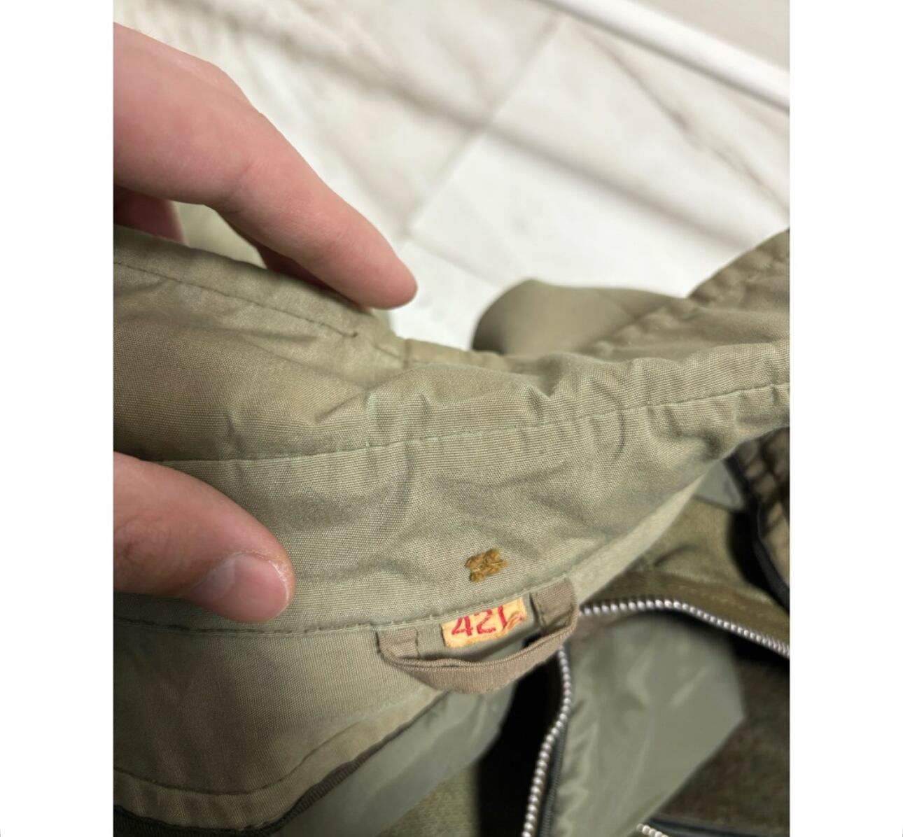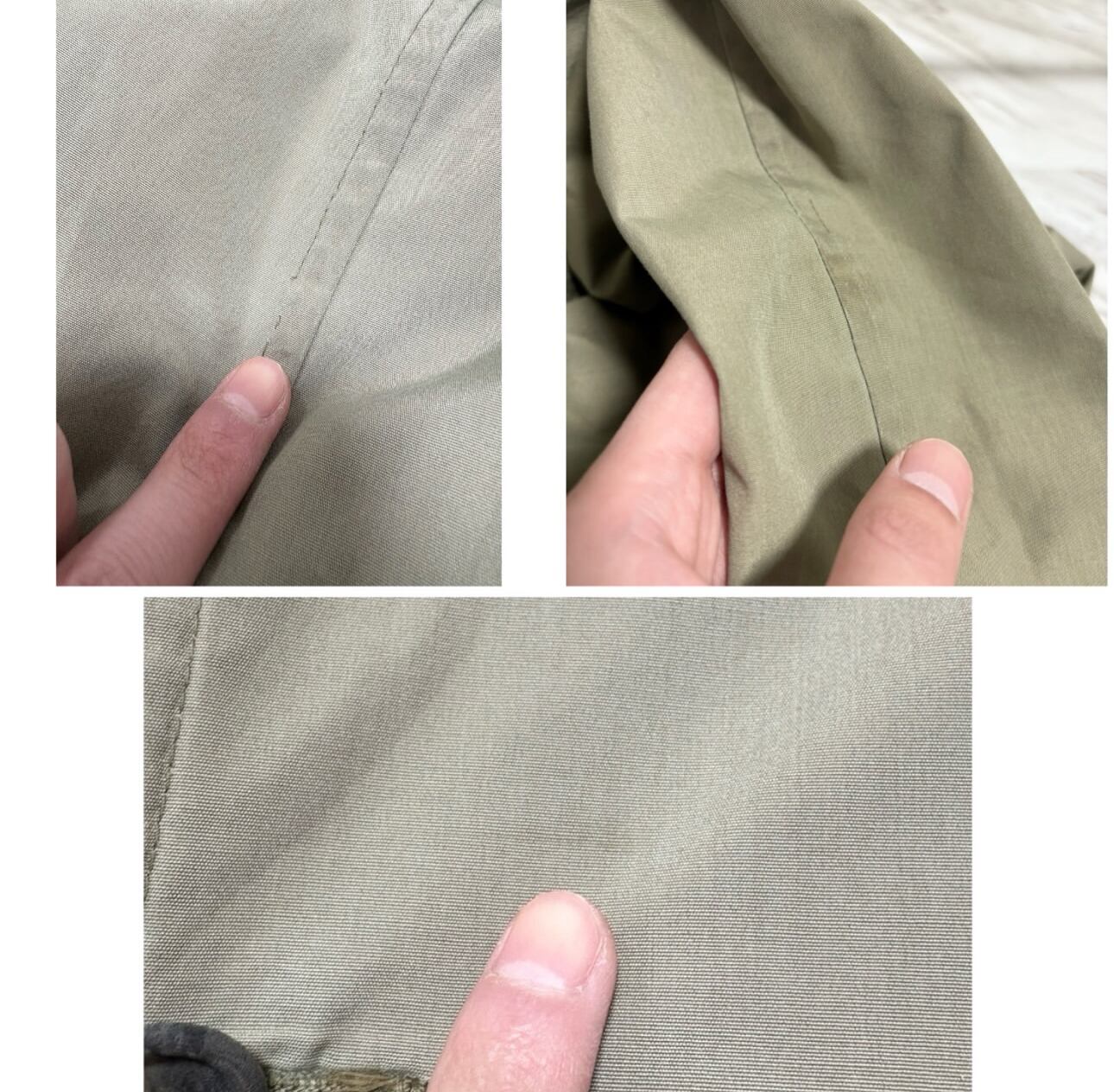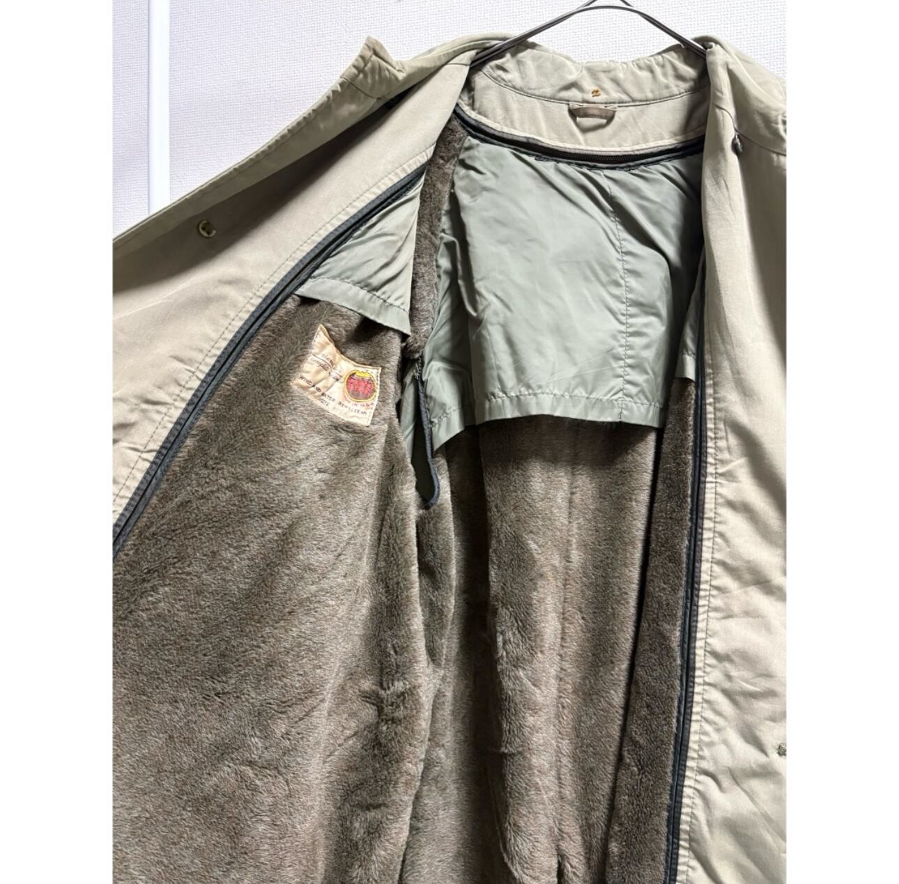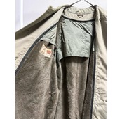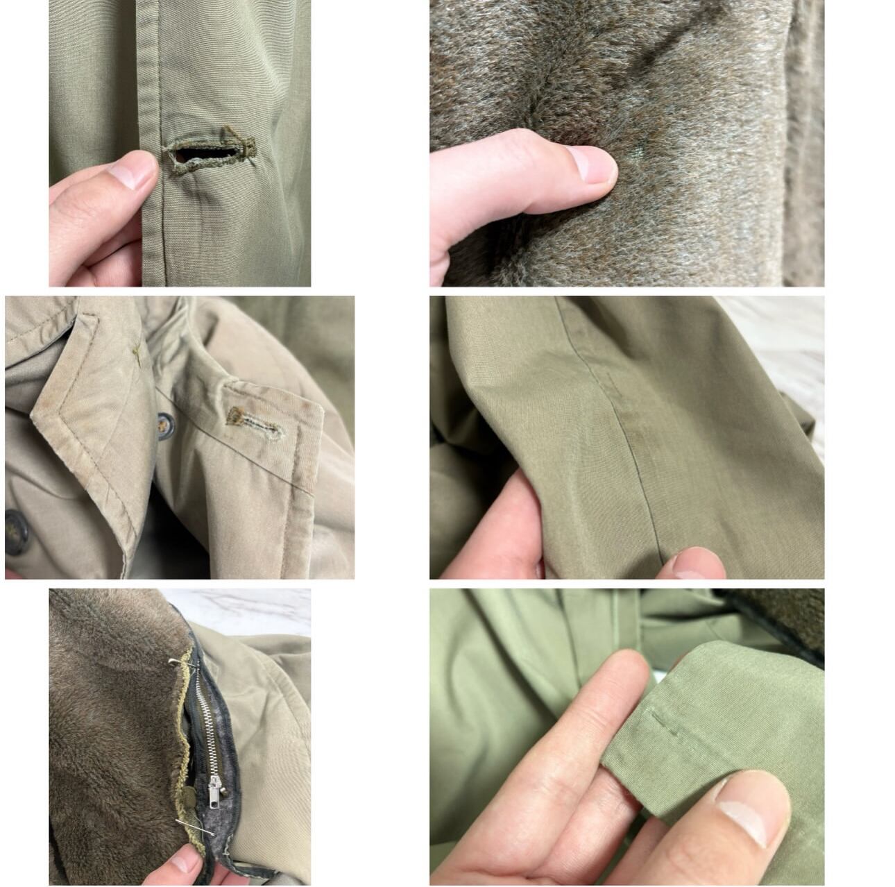 アームシーム、襟裏、裾、に少し茶ばみ その他茶ばみ部分はありますが、そこまで気になる様なダメージ汚れはありません 袖先少しだけ擦れ インナーのチャック部分の再度裾にダメージがあるのでクリップで留めてあります