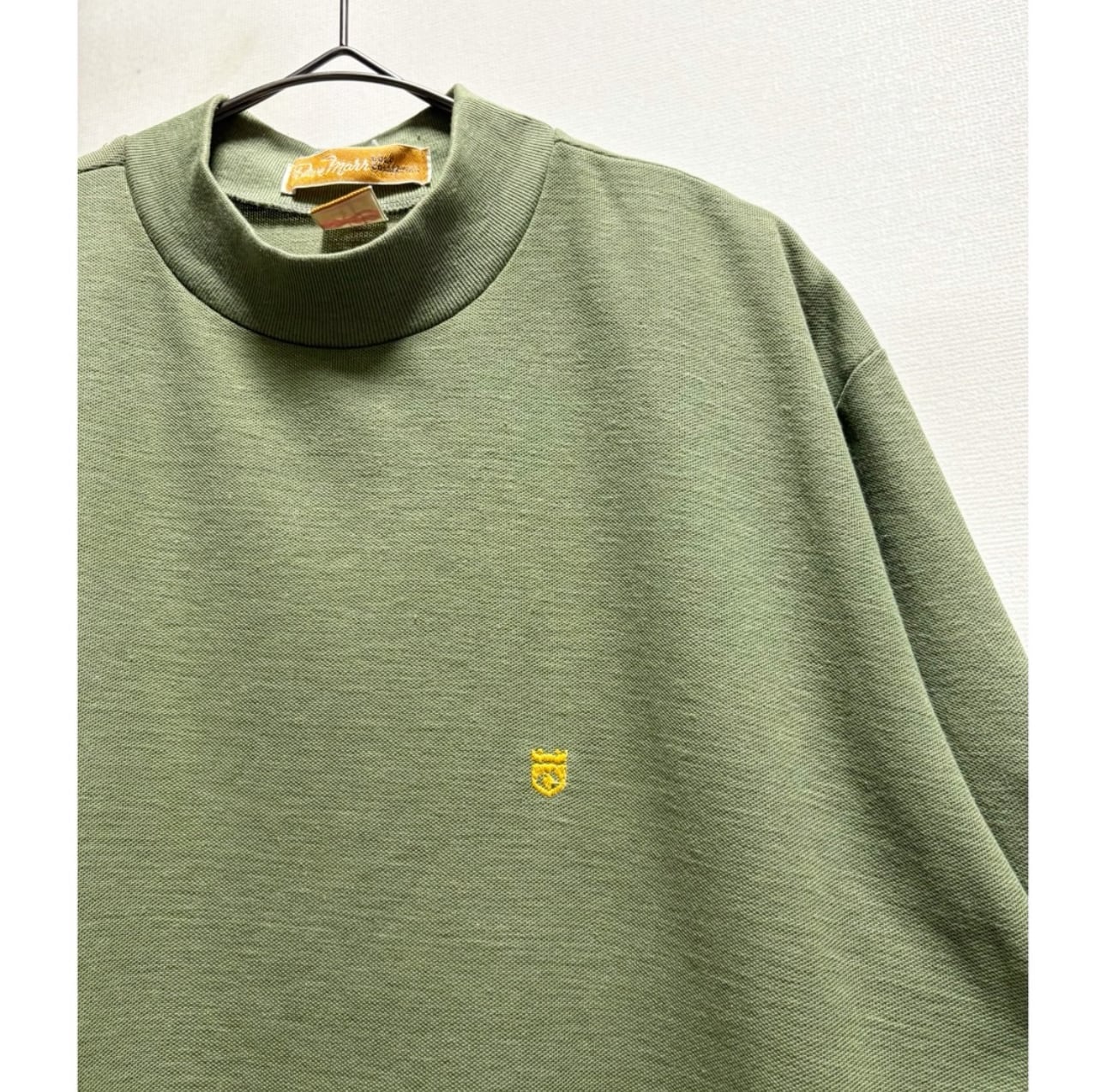 珍しいハイネックの半袖カットソー 明るめのオリーブグリーンにイエローの胸刺繍ロゴが映えます