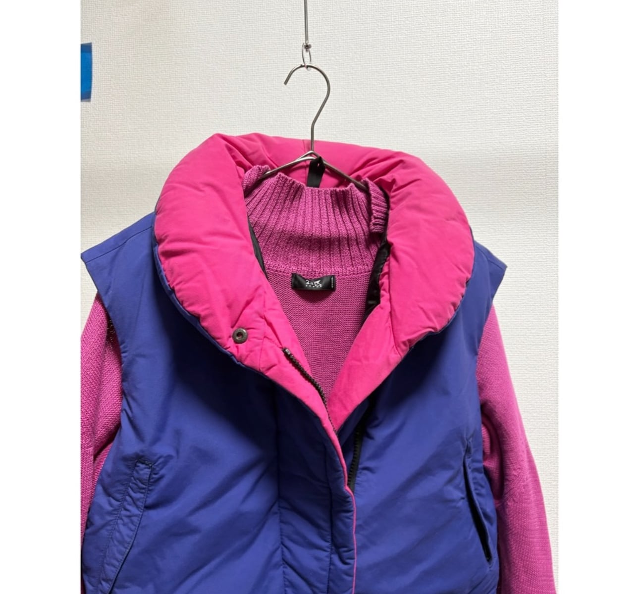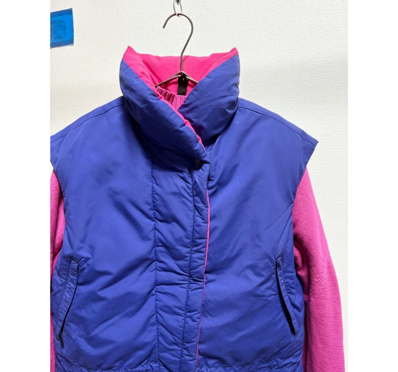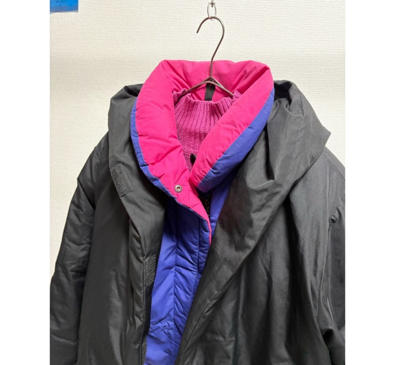 パープル×ヴィヴィッドピンク 斜めに作られたバイヤスジップ かなりボリューミーな首元 どこか"和"を感じるテイスト