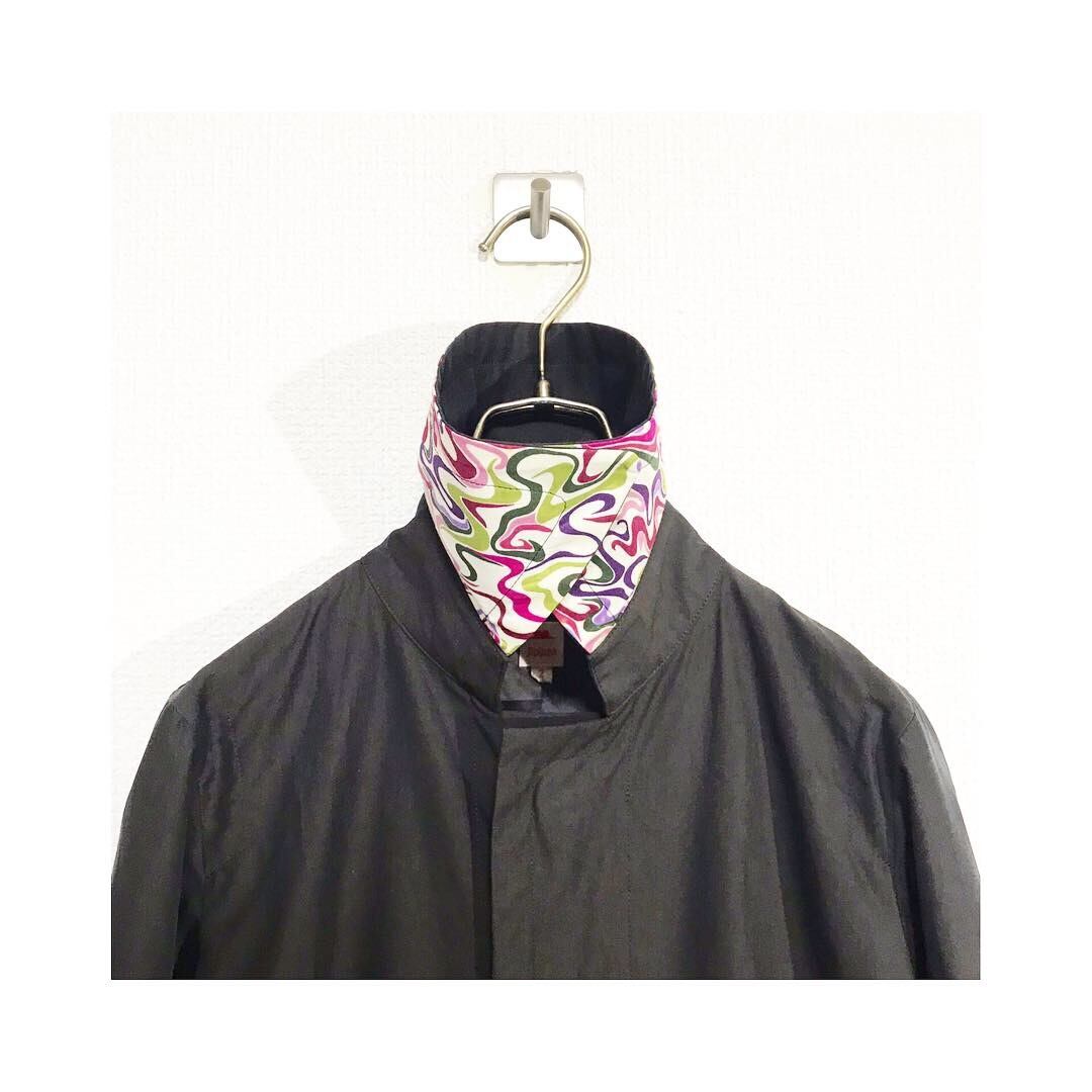 大きめの襟 襟裏はサイケデリックな総柄 襟を立てて着こなしても良さそうです