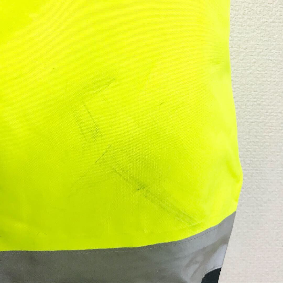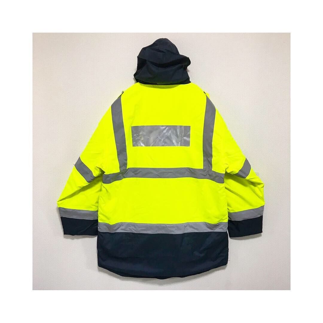 主張強めのリフレクター真っ暗な闇での作業ですぐに何処にいるか分かるように付けられたもの に蛍光黄色と紺色のボディー 作業服になりすぎない長めの着丈も良い