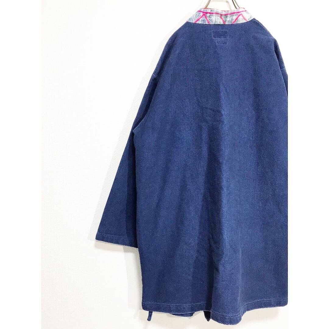 ジャパニーズヴィンテージ風な羽織 柔道着の様な超肉厚コットン インディゴ染めによって染め上げられた濃紺ボディーにヴィヴィッドピンクの刺繍 ガバッと羽織れるオーバーサイズ 未使用品なのでこれからの経年変化を楽しめそう