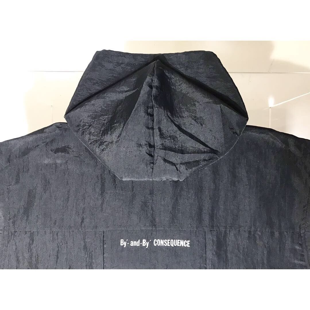 ガシガシのオールブラックナイロン に小さめのクールバックプリント 身幅広め アームホールはボリュームが出るようにプリーツが入っています 着丈短めにギュンギュンのリブ