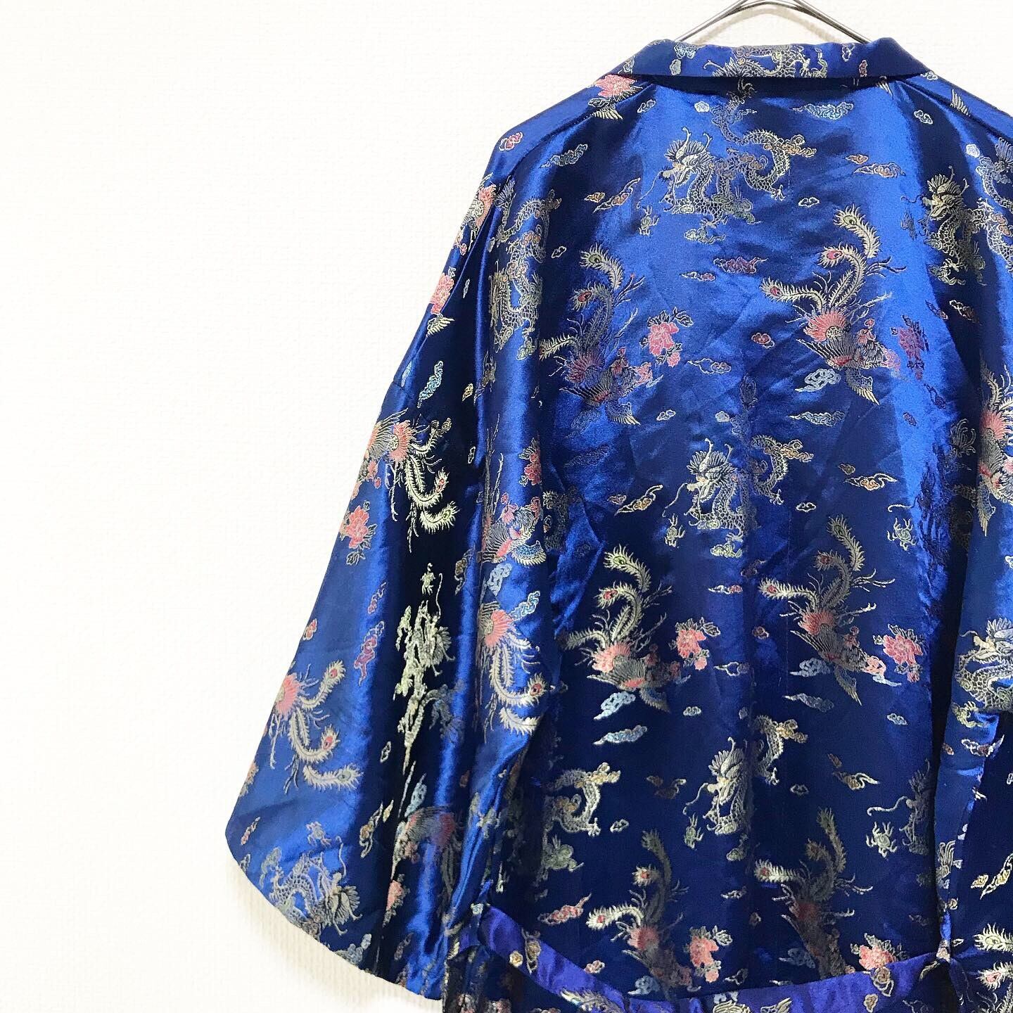 全体に撒き散らされた龍の立体的な刺繍 鮮やかなブルーに裏地は虹色 男女ガバッと羽織れる希少な大きめなサイズ感 この手のガウンの中でもかなり秀逸な一品