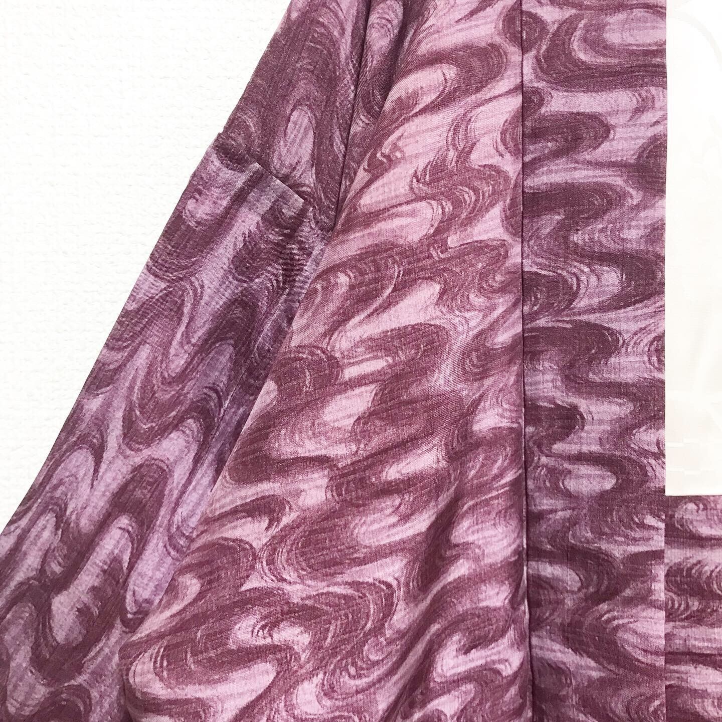 燻んだ渦柄 裏地も和柄 赤みがかったパープルボディー ガバッと羽織れるサイジング 絞り付き