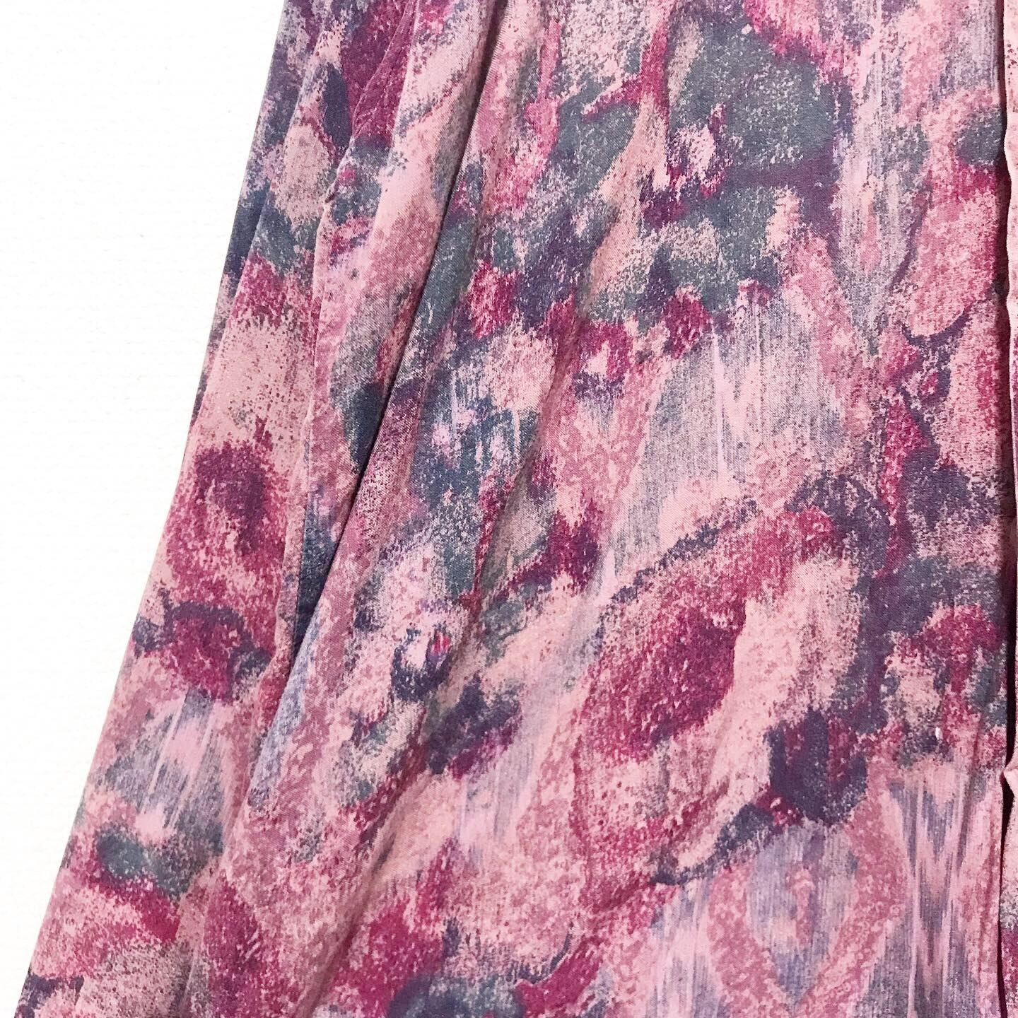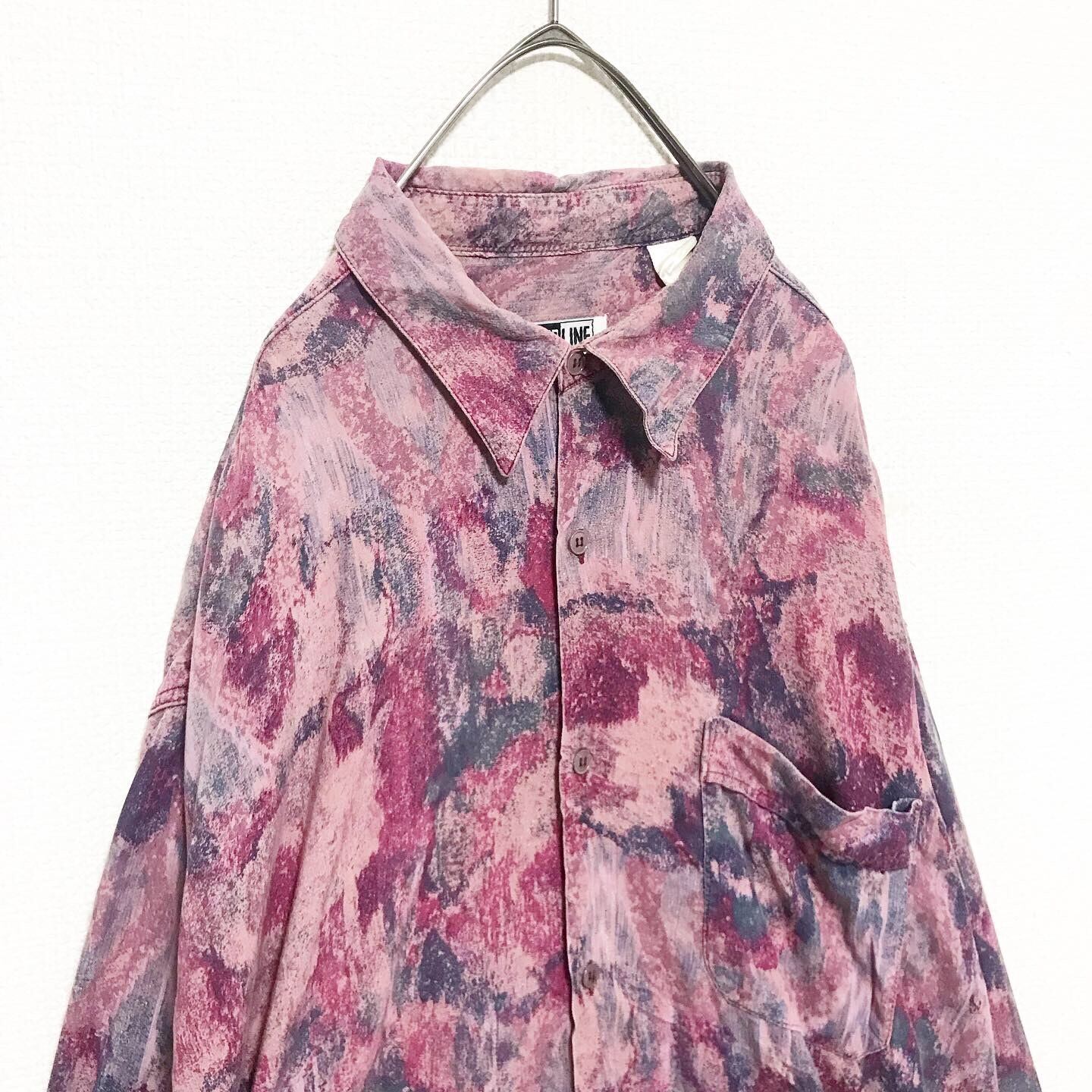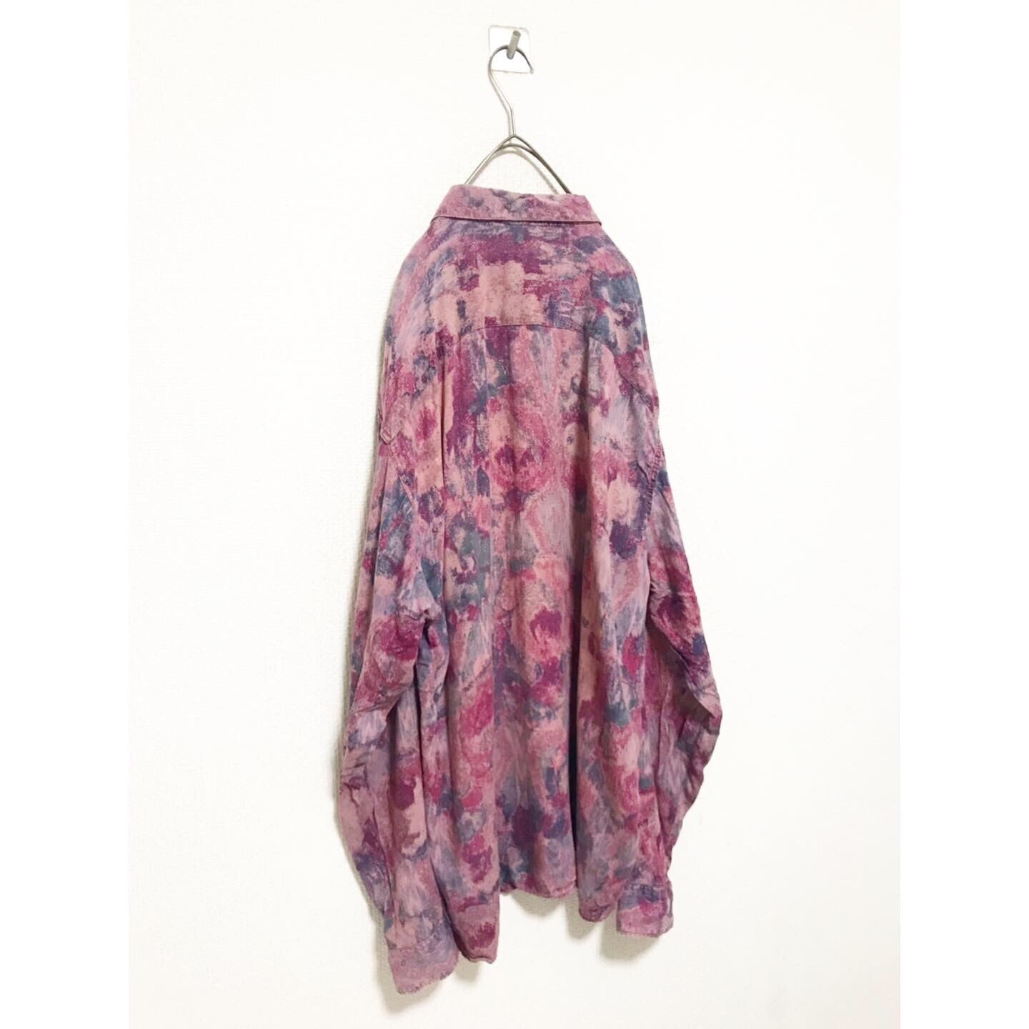 あまり見かけないパターンの総柄 パープル ピンク系の気分な色味 ガバッと羽織れるオーバーサイズ 嬉しいワンポケ とろとろのレーヨン素材