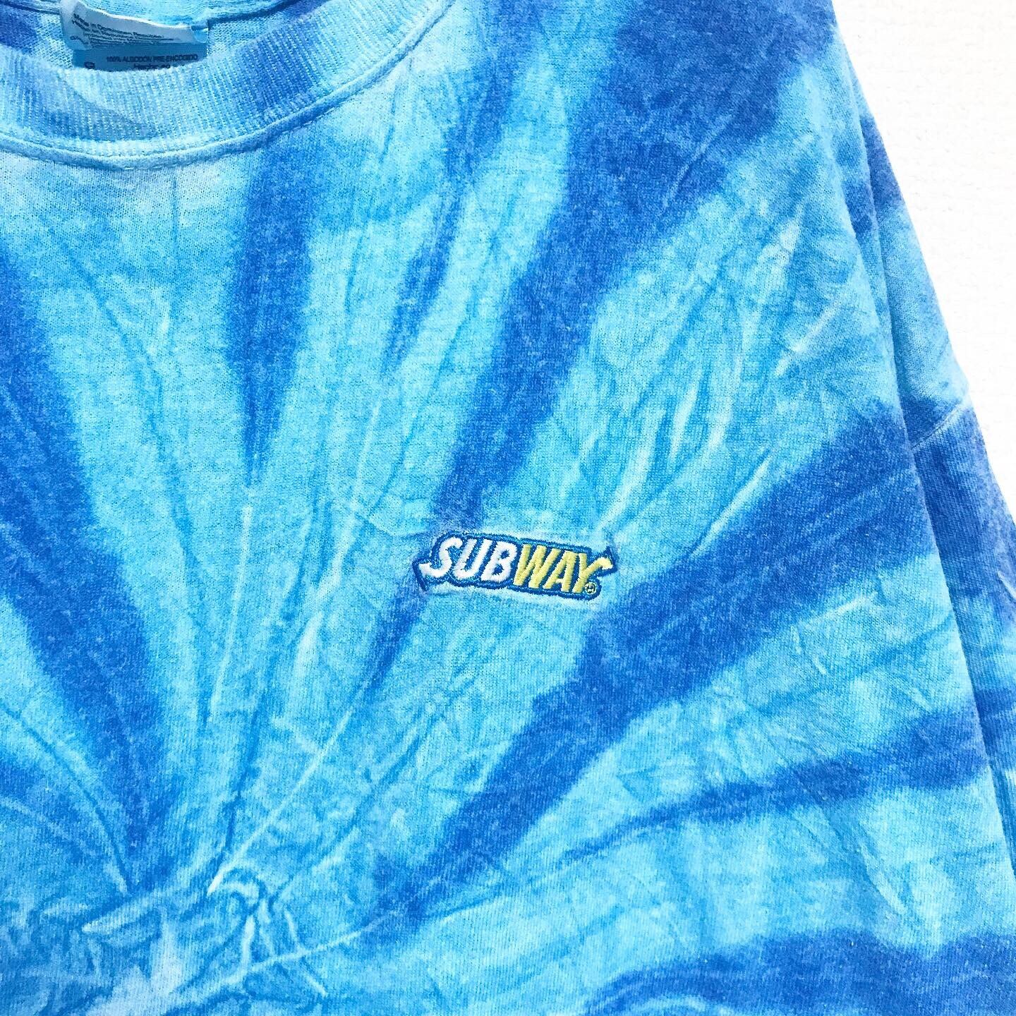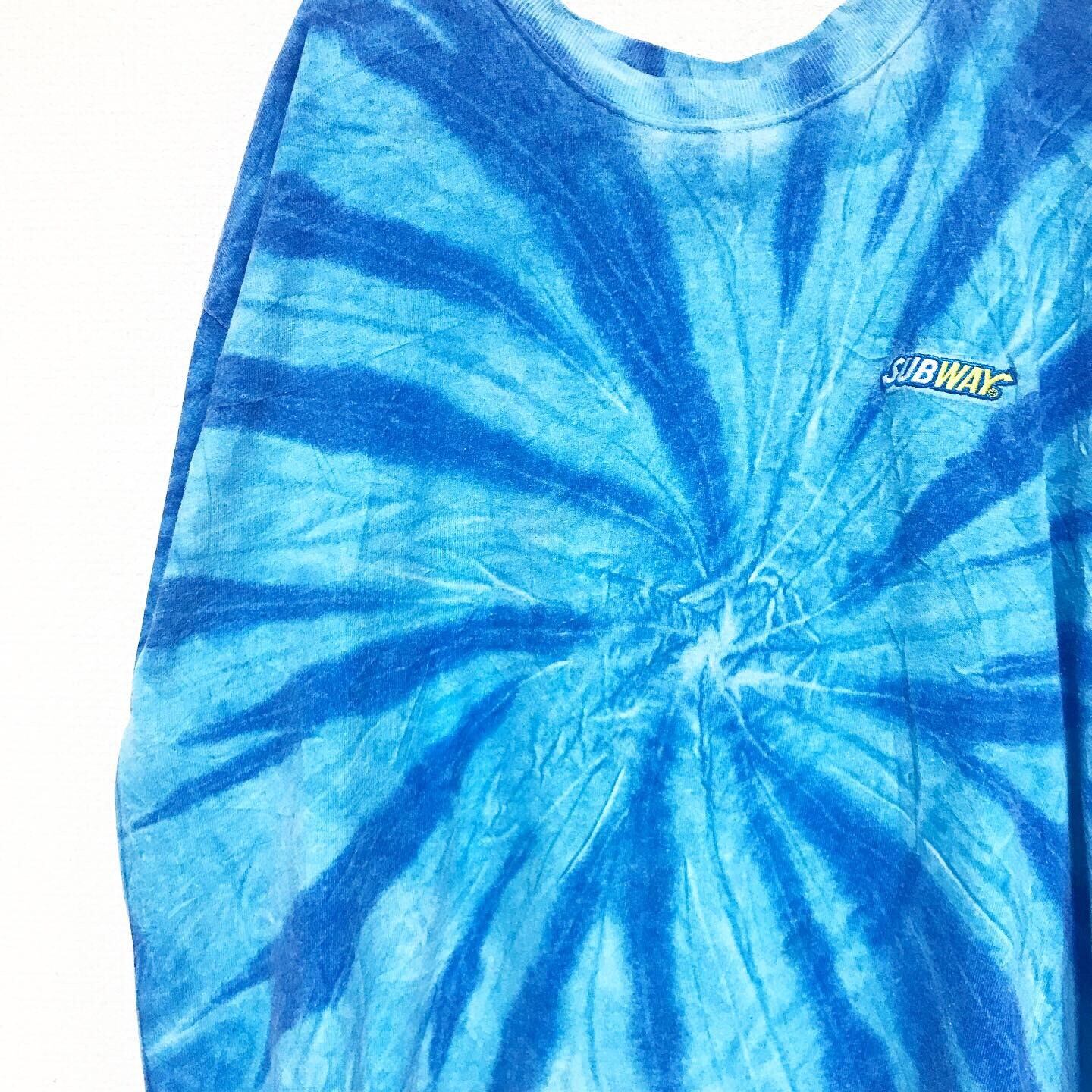 夏には嬉しい涼しげな水色 ブルー 中心に向かって渦を巻くような秀逸なタイダイ染め 胸にはサブウェイの刺繍ロゴ サイズ カラー 絞り染めの加減 ロゴ位置 全てが良いバランス