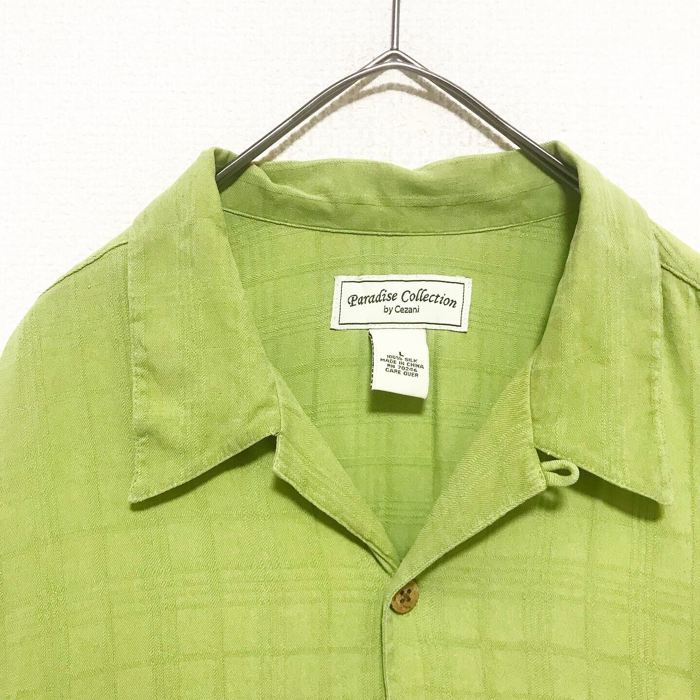 鮮やかなライムグリーン 近くで見ると細かいチェックパターンになっています フラップループ付きのオープンカラー 身幅たっぷりのワイドシルエット コルクボタンも夏っぽくて良い