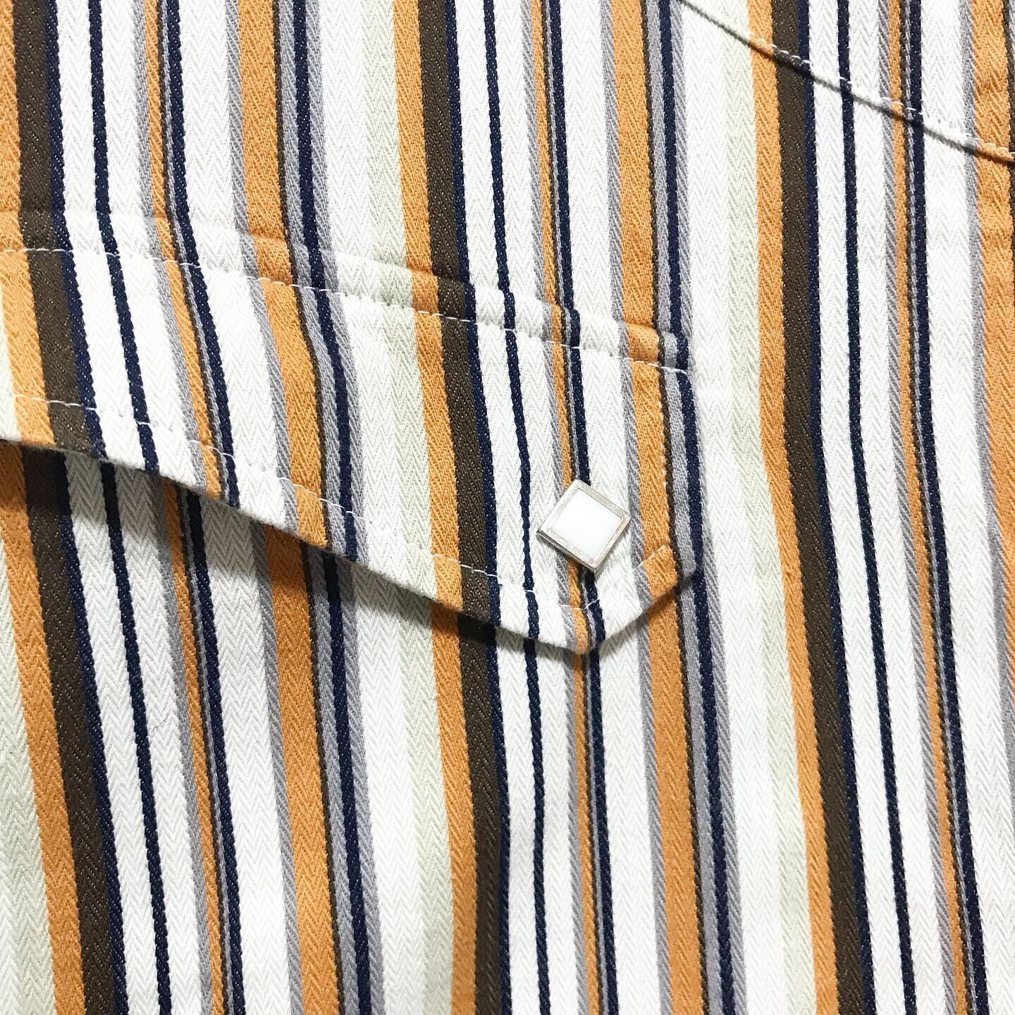 フルジップなので夏の羽織りとして機能します オレンジなど暖色系のシャドーストライプ ダブルポケットにはダイヤモンド型のボタン バックの切り替えも秀逸