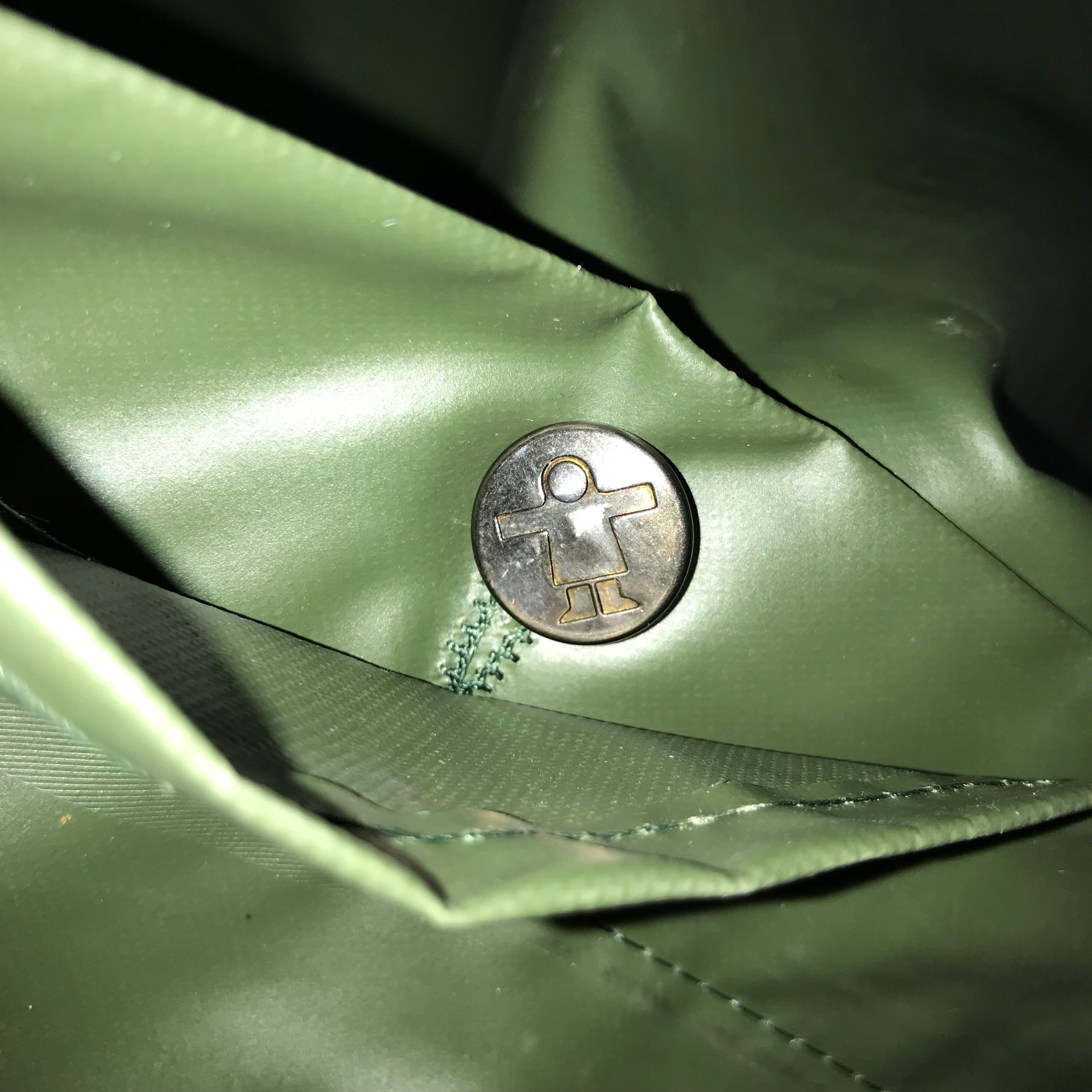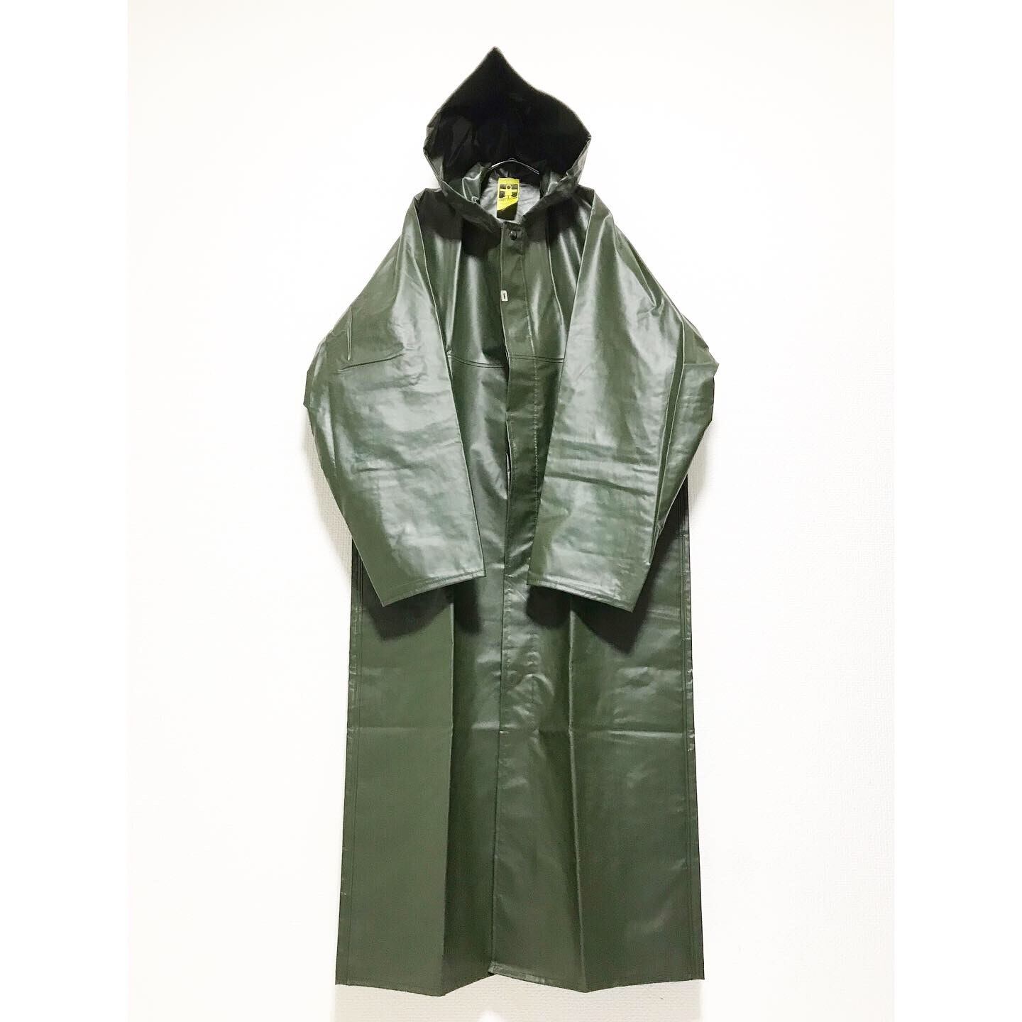 pvcラバー素材 紐付きのフード 梅雨を余裕で凌げます 程よく大きめのサイジング オリジナルボタンのデザインもクール