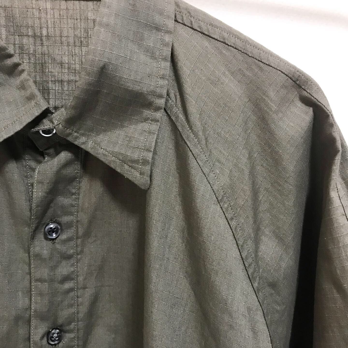 オールリップストップナイロンのミリタリーテイスト 色味はオリーヴ プルオーバーという所も良い ラグランなので肩スッキリ 大きめのサイジングではないのでしっかりと着れます