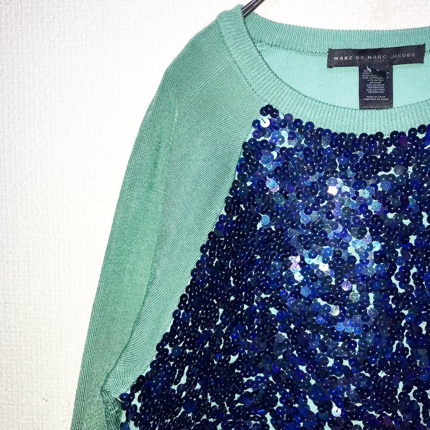 フロントに大量のミラー仕様のラメが付いたニット ミントグリーンのボディーとダークブルーのラメの相性が良い