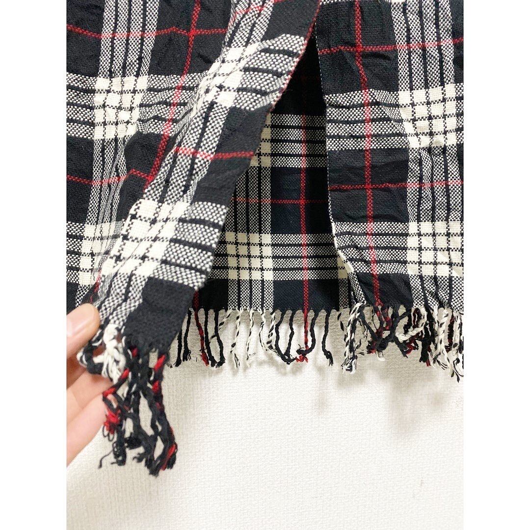 長めのマキシ丈 ブラックにホワイト、レッドのライン 高配色タータンチェック 裾はフリンジ仕様
