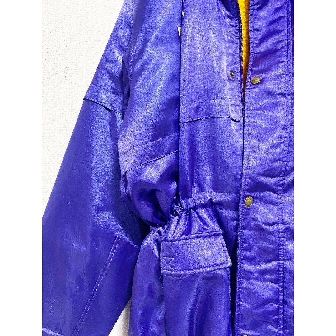 パープルの艶の出るサテン地 ハイネック 胸、背中にロゴ アーム部分にもラバーロゴ