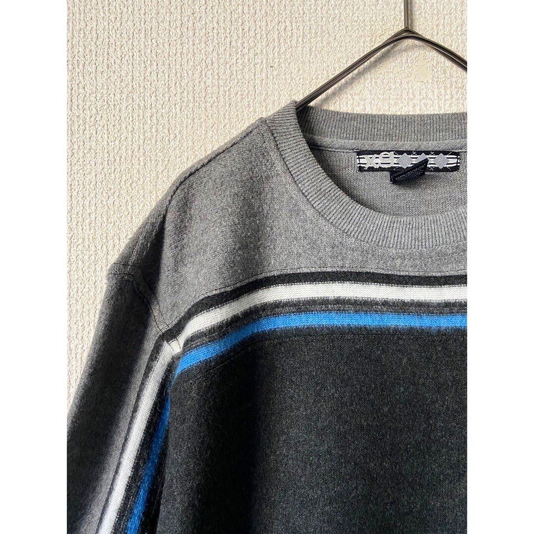 90年代らしい少しナードなパターン ライトグレー、チャコールグレーの切り替えにホワイトとサックスブルーのライン 薄手のポリ、アクリル、レーヨン、コットン 肌触りとしてはカシミヤに近い