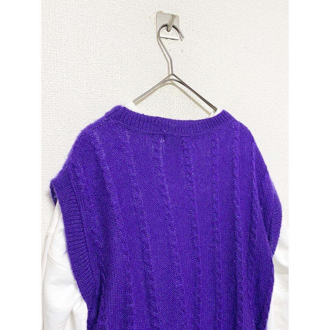 鮮やかな濃い目パープル 上部と下部で編み方が変わります 若干透けるので中に柄物を持ってきても面白い 涼しげなアクリル100%