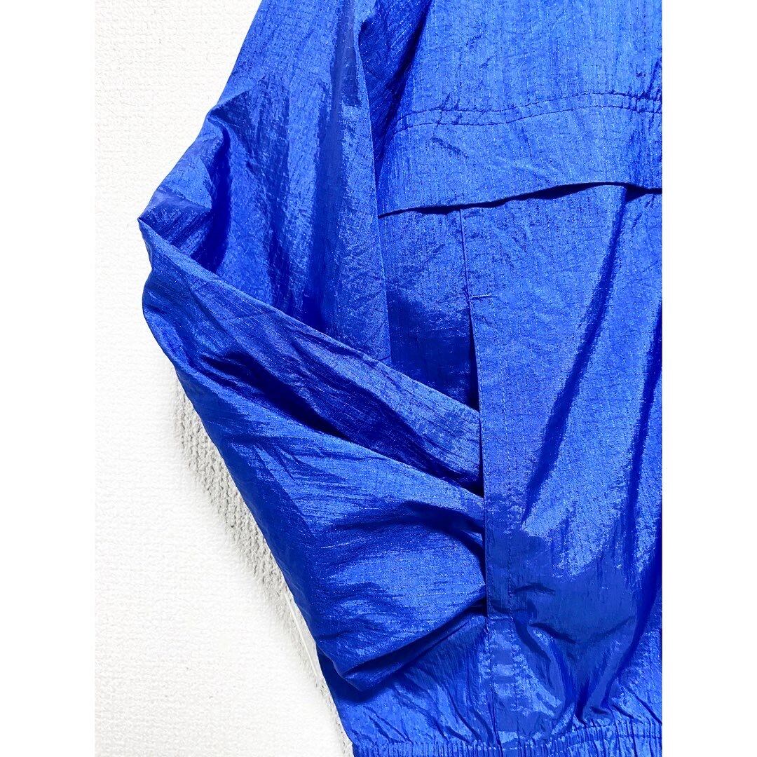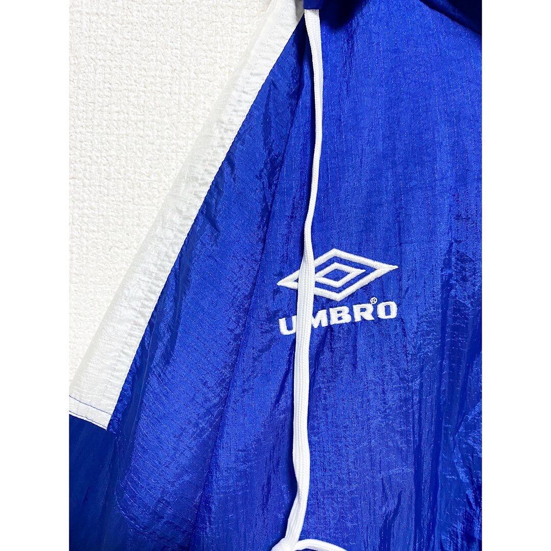 ブルーとホワイトの切り替え 胸に刺繍ロゴ 収納フード ハイネック アンブロのロゴテープも良い感じ