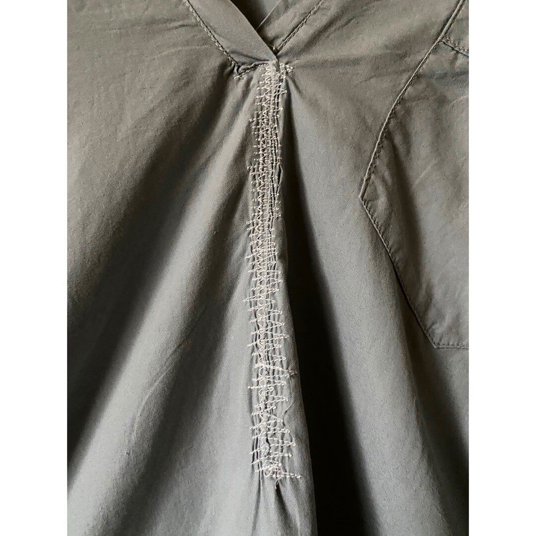 水色とグレーを混ぜた様なアイスグレーのコットン地 vネック下はギザギザステッチ 胸ポケットも良い感じ