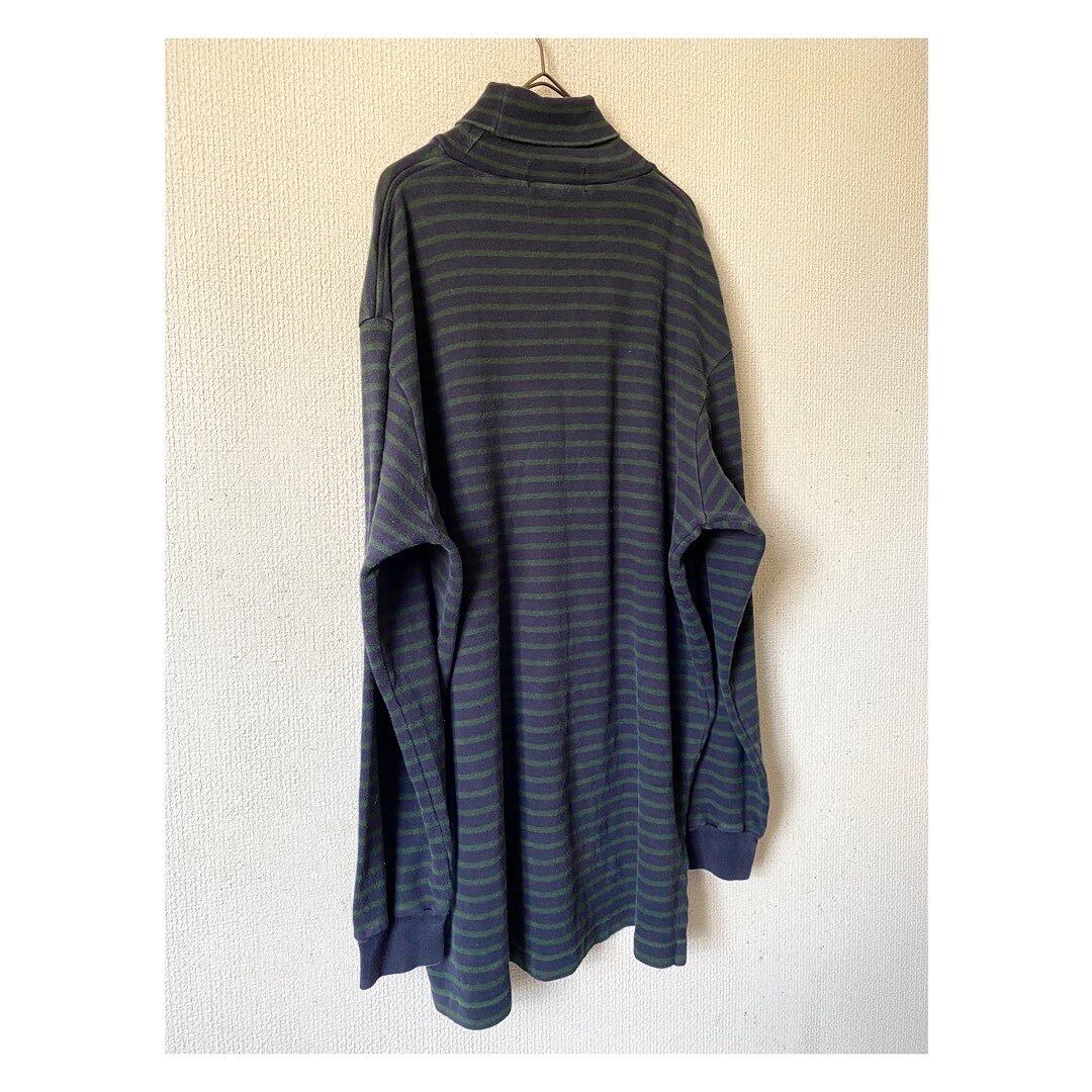 xxl程度のオーバーサイズ 緑と紺色のピッチの幅が狭い細ボーダー タートルネック