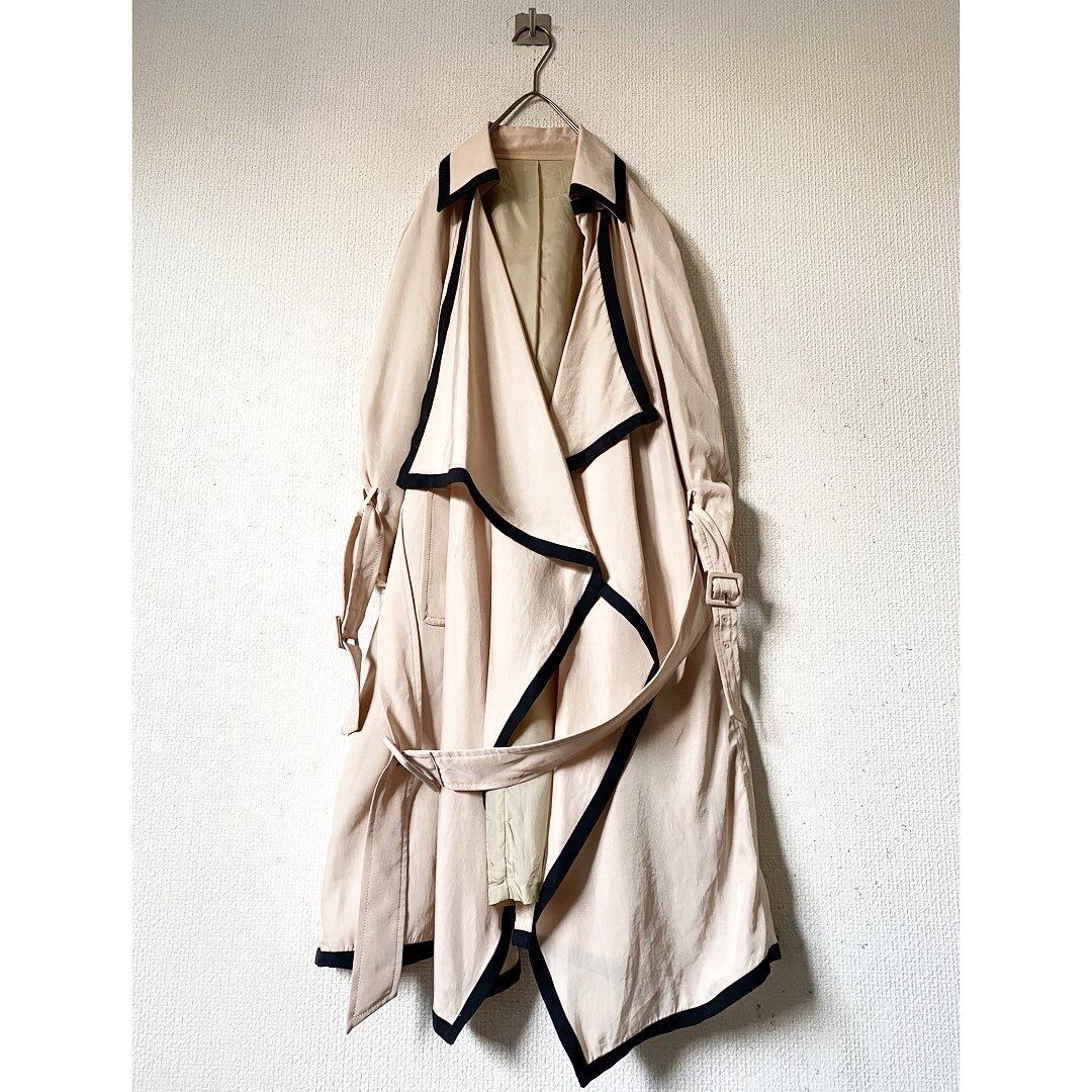 この時期でもさらっと涼しく羽織れるポリ素材 前立てが余った面白いデザイン 縁はブラックへの切り替え 粋なノーボタン サーモンピンクがかったベージュ 所々のベルトが良い味を出しています