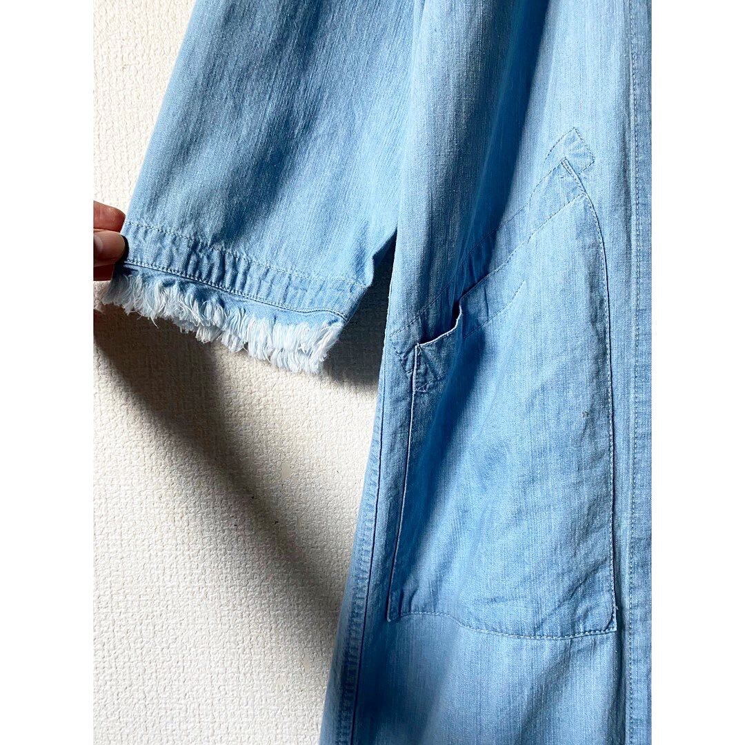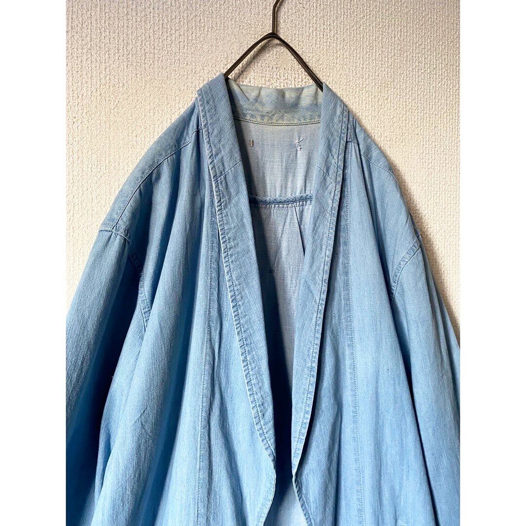 珍しいインディゴ染めのロングガウン 粋なノーボタン 緩さが良いですね 背中にタックが入っていて、ボリュームと裾の広がりを強調するデザインとなっています