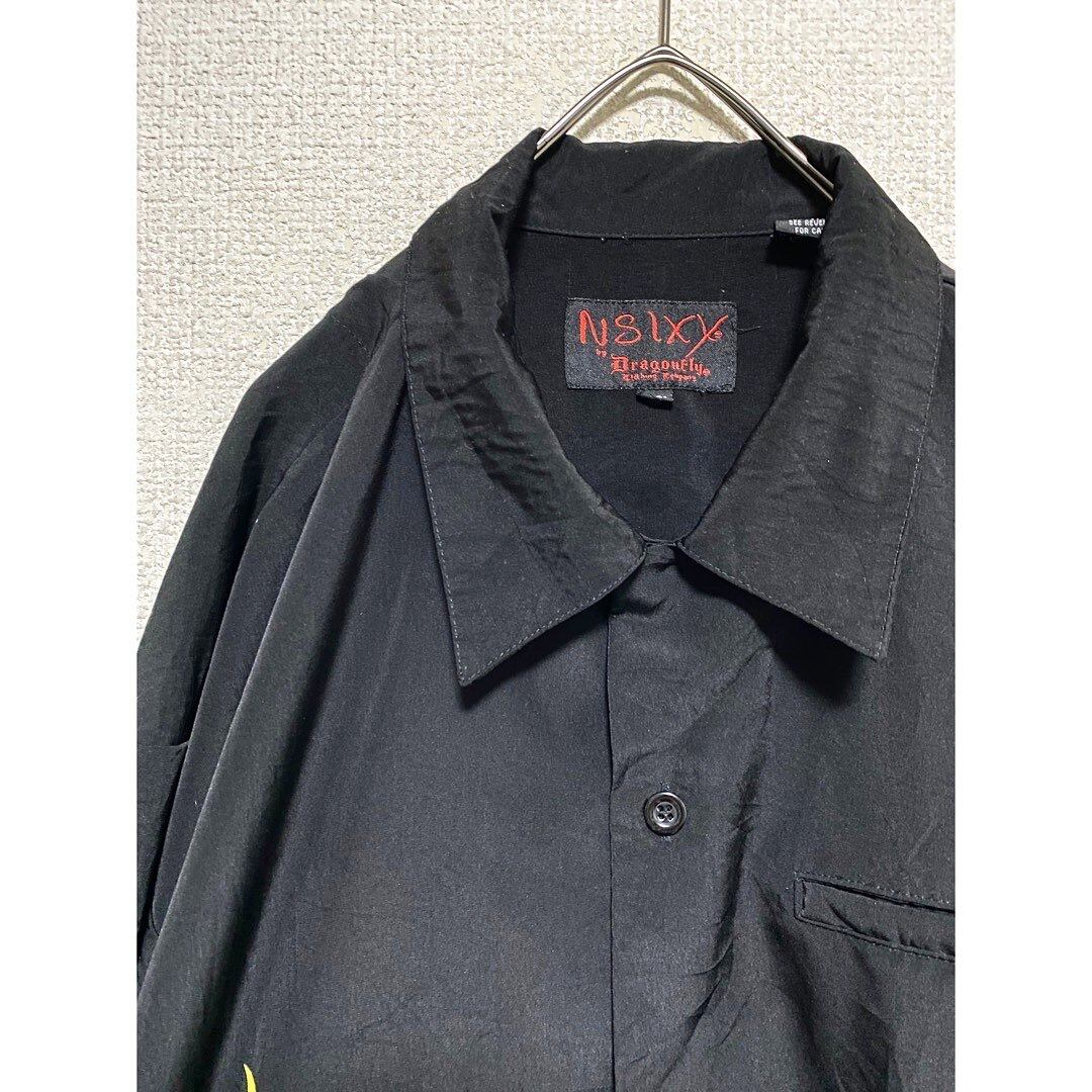 1990's スカルプリントブラックポリオープンカラーショートスリーブシャツ