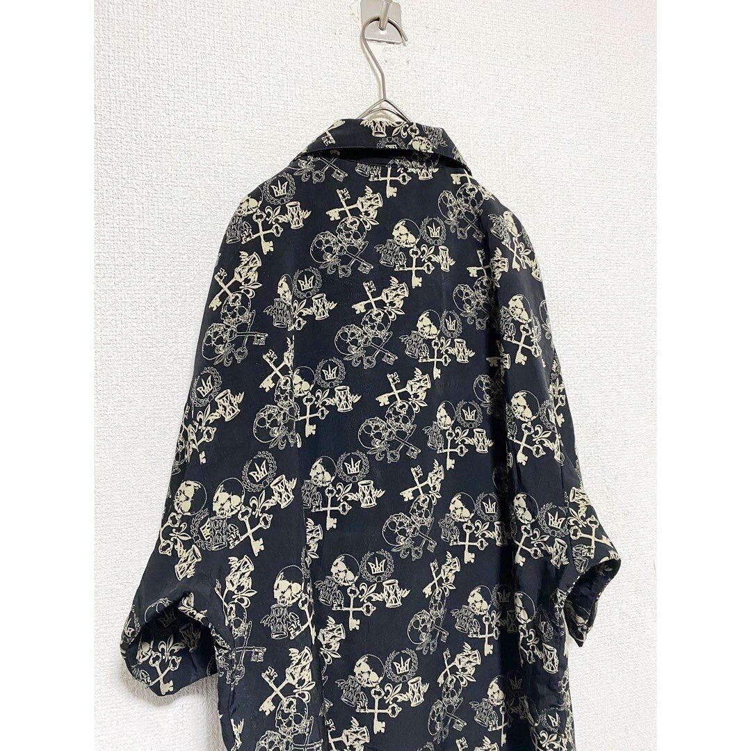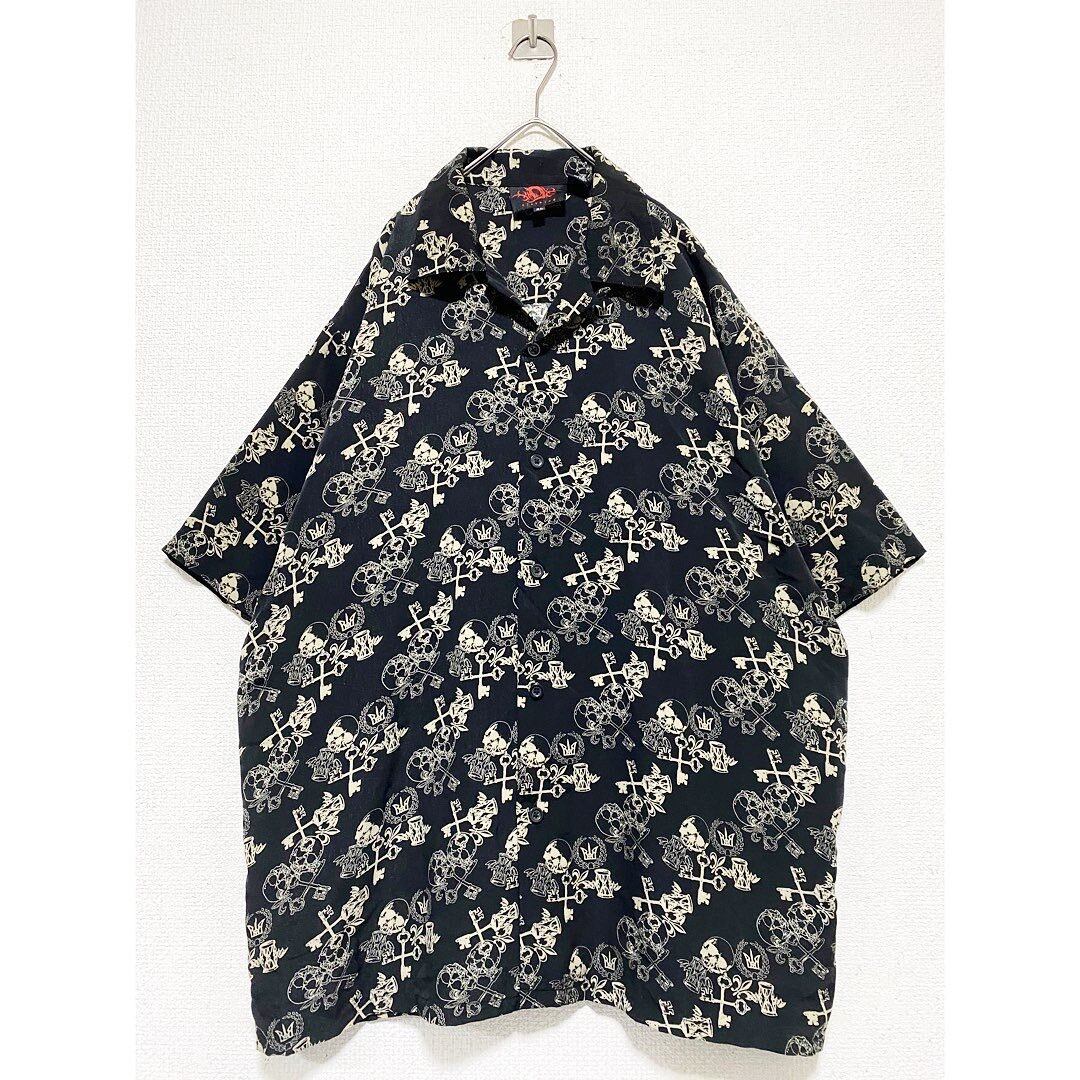 1990's スカルプリントブラックポリオープンカラーショートスリーブシャツ