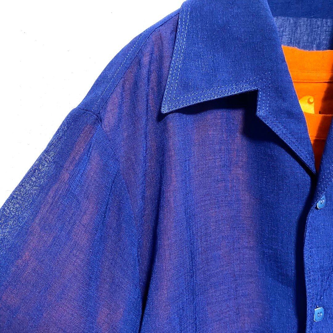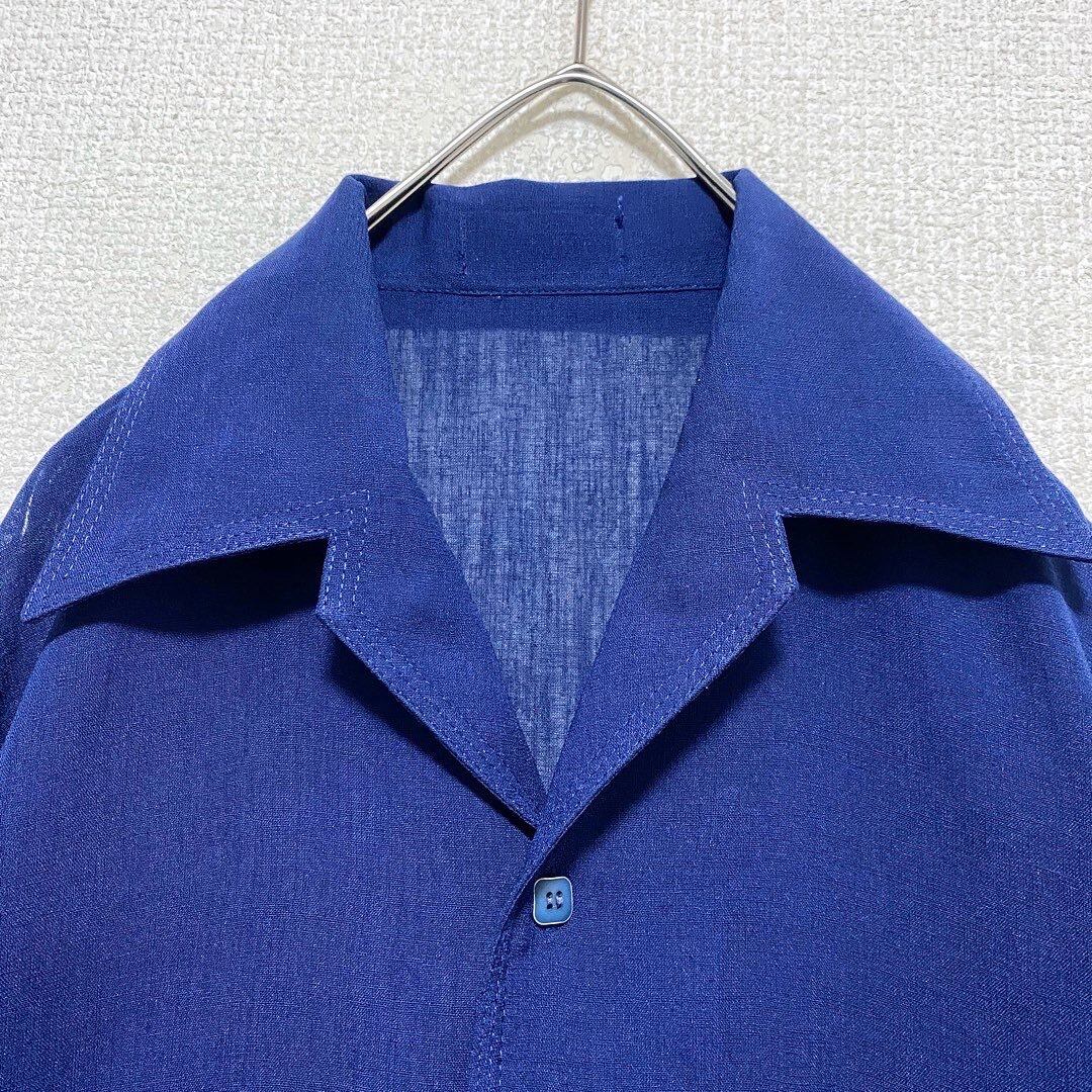涼しげなポリ素材 オープンカラー 真四角のターコイズブルーボタンも良し