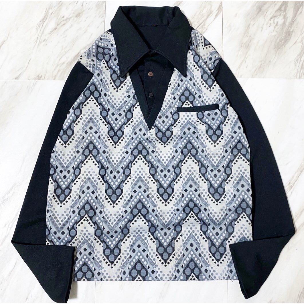 何とも形容し難い柄のパターン フロントボタンが真ん中だけブラウン 70年代らしい尖った襟