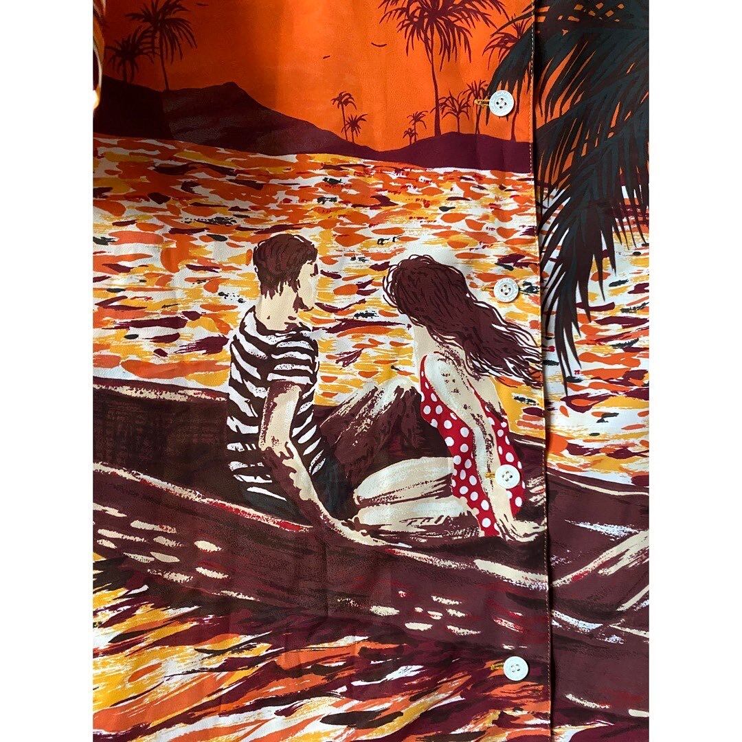 オレンジ、ホワイト、ワインレッドの波を筆で書いた様なプリント フロントプリントにボートを漕ぐカップル 前立てを通して繋がる絵