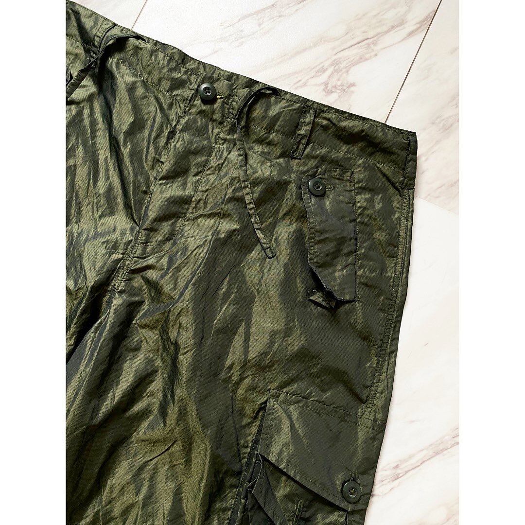 サイドポケット 裾にはカーゴパンツ仕様のフラップポケット、更にその上に二つフラップポケット バックに差し込みポケット 計9つの多重ポケット ウエストはドローストリングで調節可能
