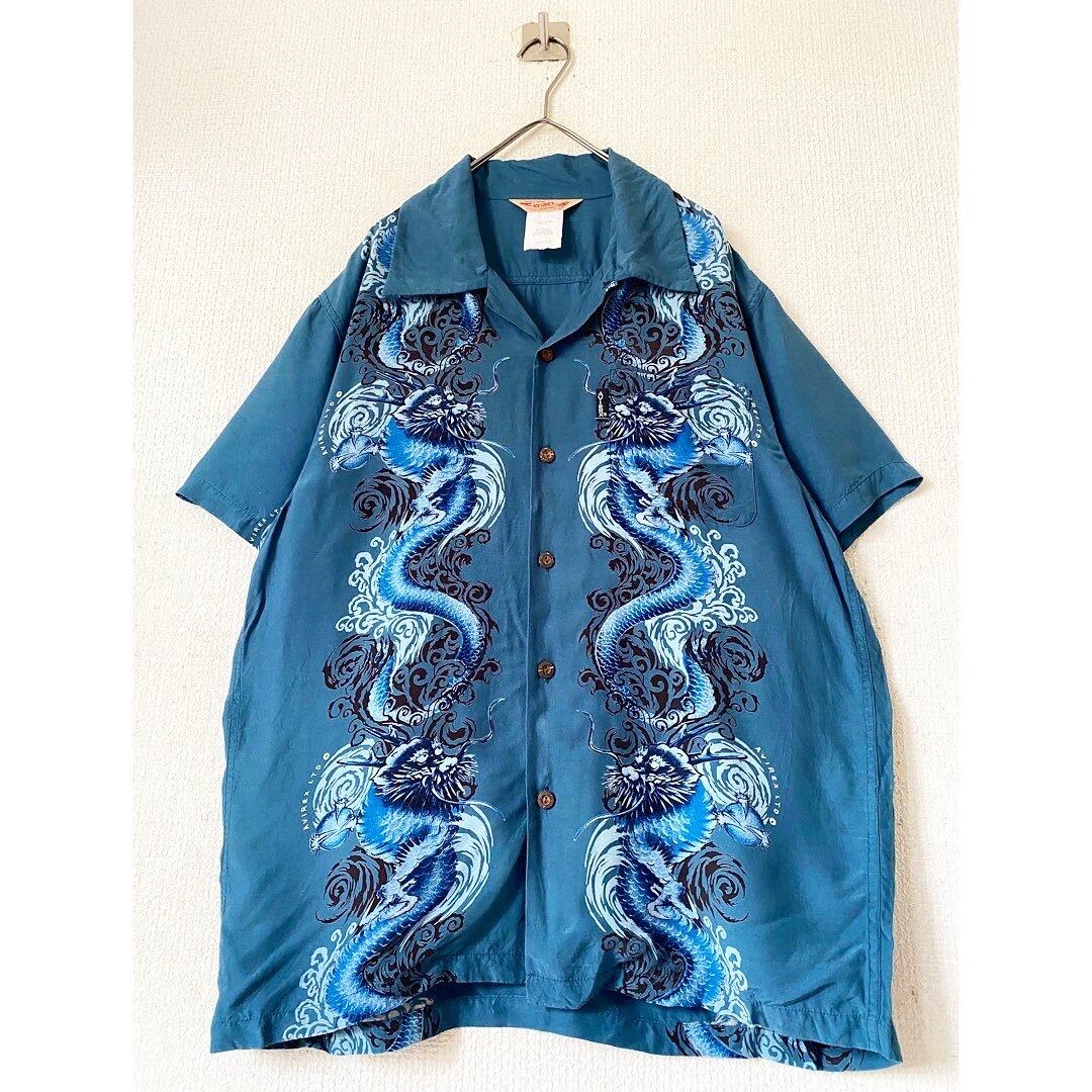 1990's アヴィレックスから エメラルドグリーンドラゴンオープンカラーレーヨンシャツ