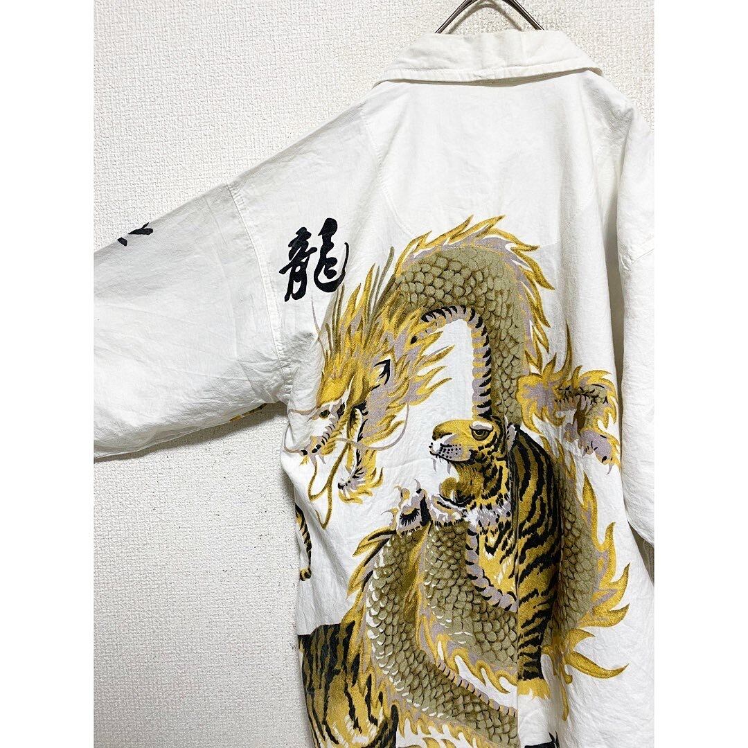 龍と虎が戦っているプリント 所々に散りばめられた龍と虎の漢字 ホワイトのコットンボディー 加えてフラップループ付きのオープンカラー