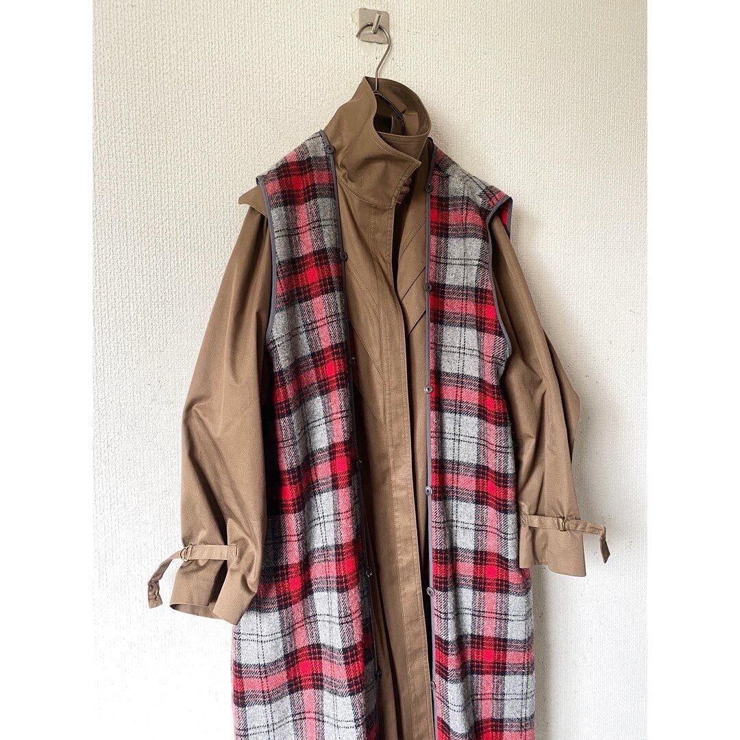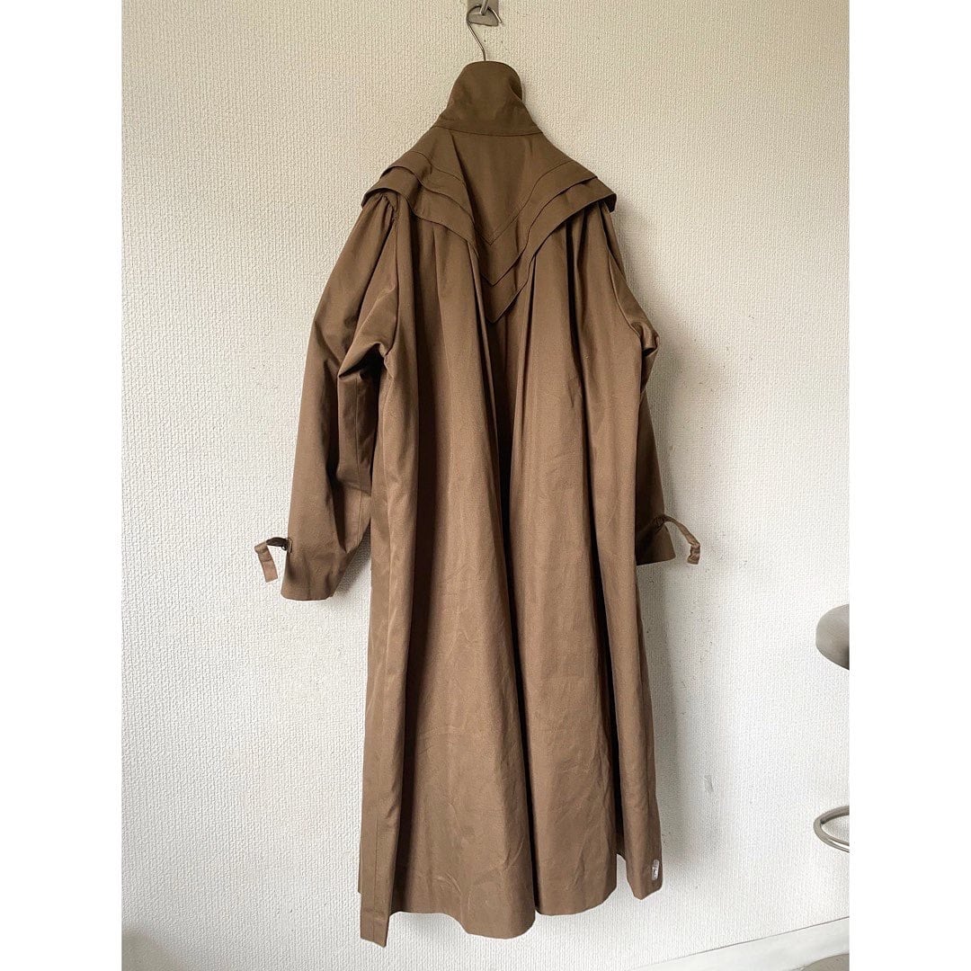 少し赤味がかったライトブラウン フロントは比翼仕立て 首元はバイアス状の変型デザイン ショルダー部分で切り替え部分がぽこっと出る感じも良いですね その下の3タックと身幅74もあるビッグシルエットが相まって美しいドレープが生まれます